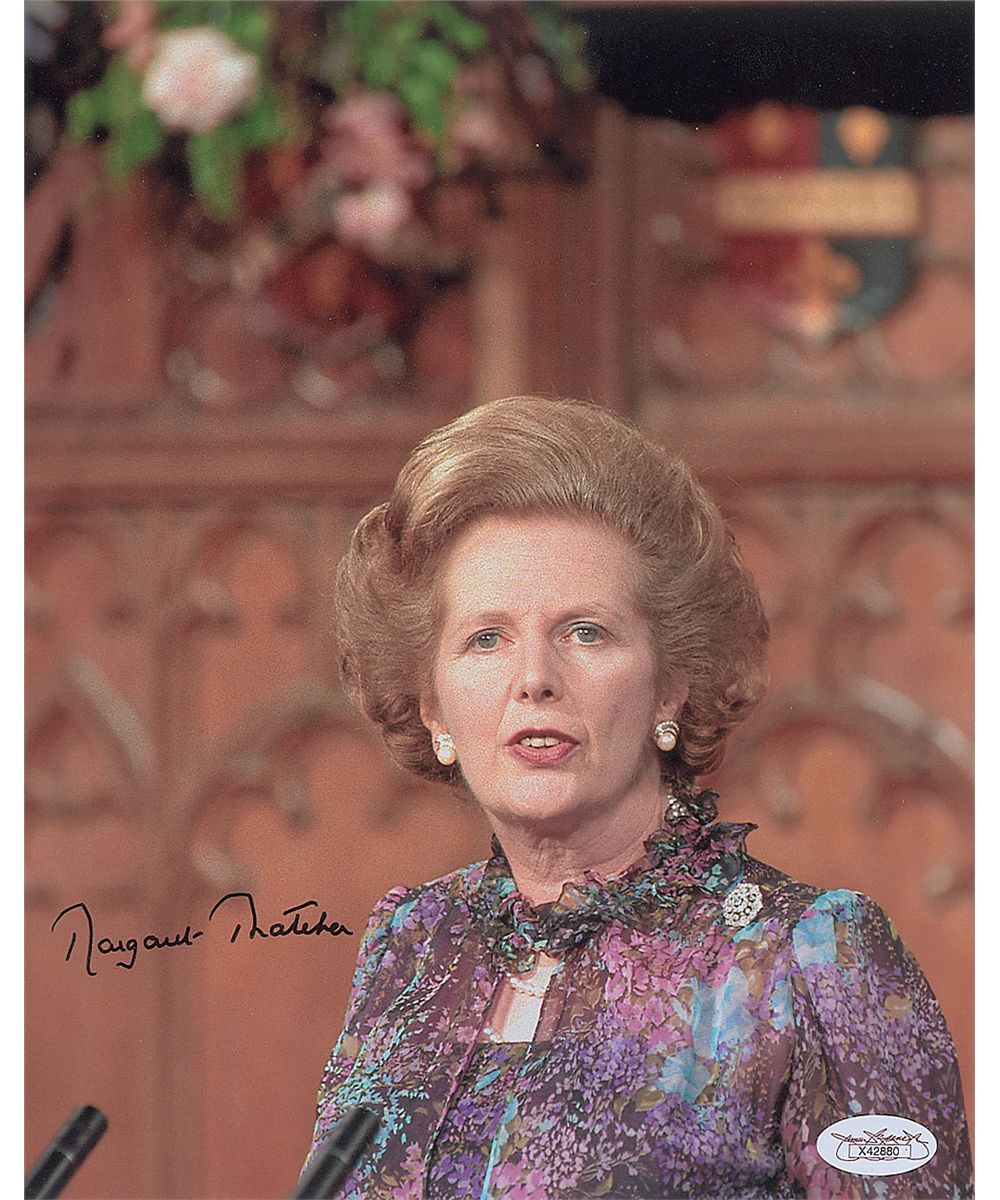 Color satin-finish 8 x 10 photo of Thatcher giving a speech, signed in black felt tip. In fine condition, with a JSA label affixed to the lower right. Accompanied by a full letter of authenticity from JSA.