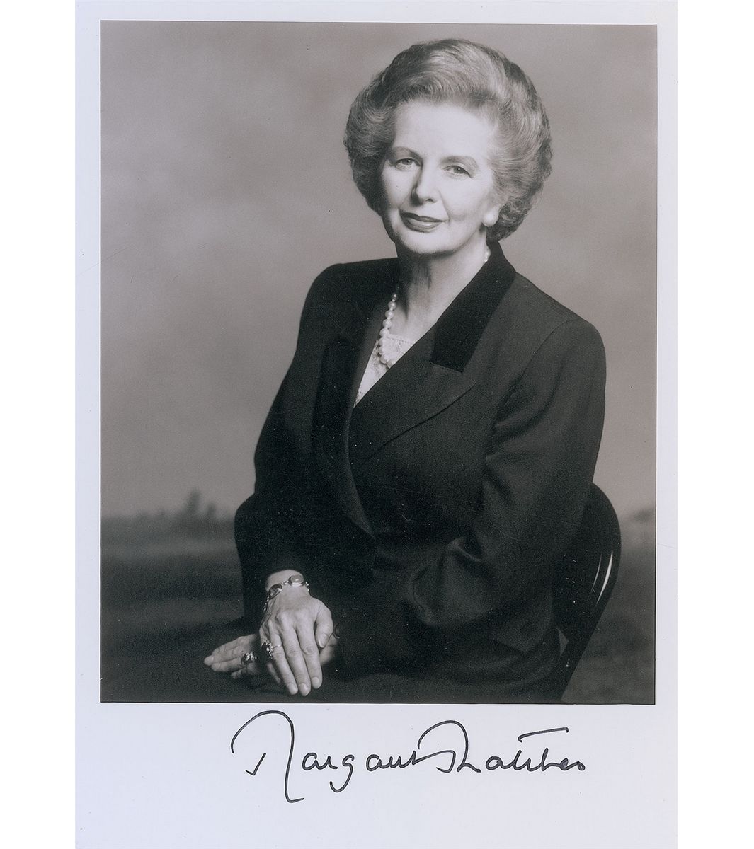 Satin-finish 5 x 7 photo of Thatcher in a formal pose, signed in the lower border in black felt tip. In fine condition, with a paperclip impression to the top edge.