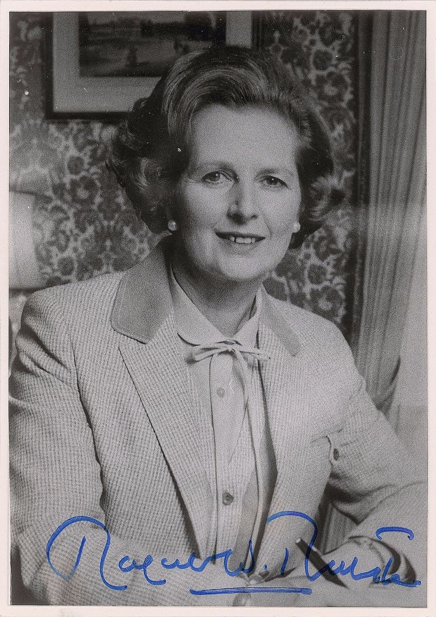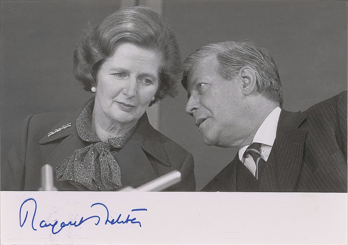 Two small photos of Thatcher, 3.5 x 5 and 5.75 x 4, each signed in blue felt tip. In overall fine condition.