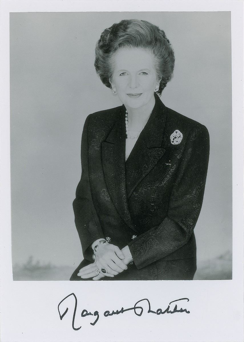 Satin-finish 5 x 7 photo of Thatcher in a formal pose, signed in the lower border in black felt tip. In fine condition, with a couple of light creases.
