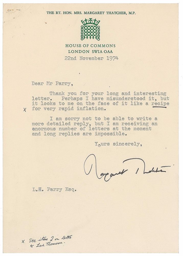 TLS, one page, personal House of Commons letterhead, November 22, 1974. Letter to L. H. Parry, in full: "Thank you for your long and interesting letter. Perhaps I have misunderstood it, but it looks to me on the face of it like a recipe for very rapid inflation. I am sorry not to be able to write a more detailed reply, but I am receiving an enormous number of letters at the moment and long replies are impossible." In fine condition, with a crease and staple holes to the upper left corner. Accompanied by the referenced Parry letter.