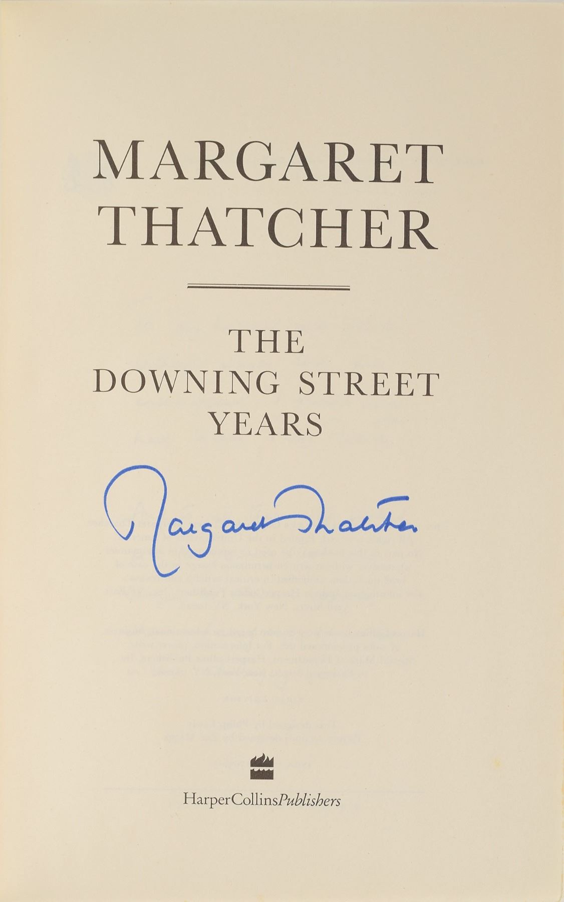 Signed book: The Downing Street Years. First edition. NY: HarperCollins, 1993. Hardcover with dust jacket, 6.5 x 9.5, 914 pages. Signed on the title page in blue felt tip by Thatcher. In fine condition.