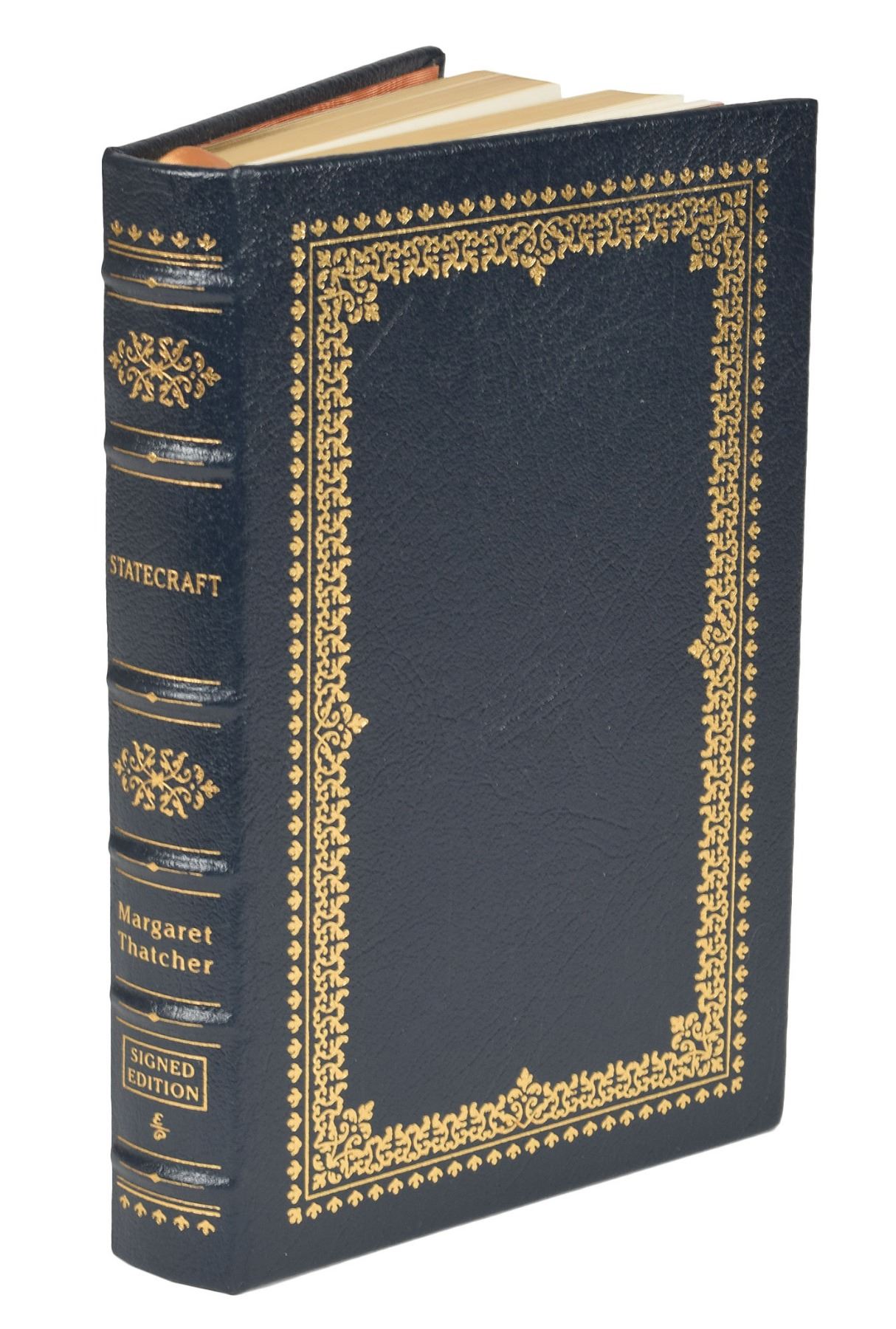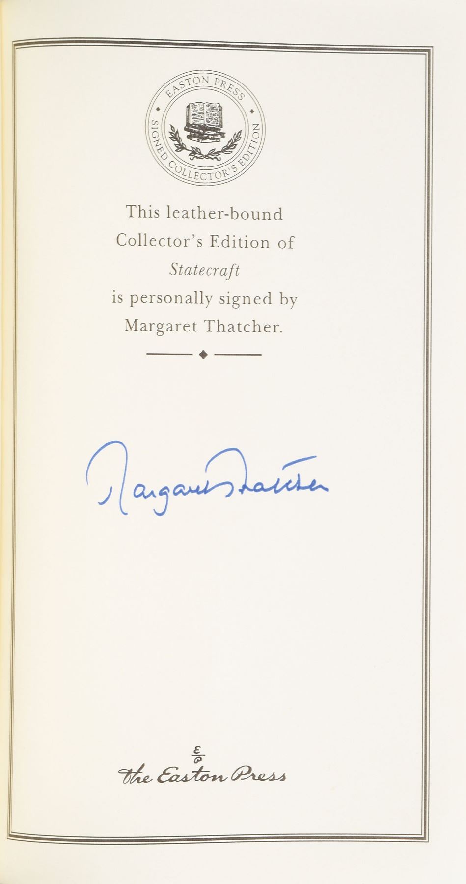 Signed book: Statecraft. Collector's edition. Norwalk, CT: Easton Press, 2002. Leather-bound hardcover, 6.25 x 9.5, 486 pages. Signed on the colophon in blue felt tip by Thatcher. In very fine condition. Accompanied by the publisher's certificate of authenticity.