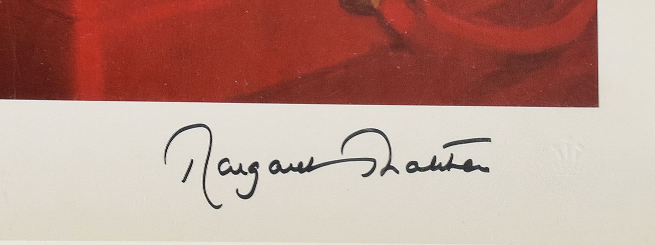 Limited edition color 24.75 x 32 print of Leonard Boden's lovely portrait of Margaret Thatcher, numbered 263/850, signed in the lower right in black felt tip by Thatcher. Tightly rolled and in fine condition, with a few light creases.