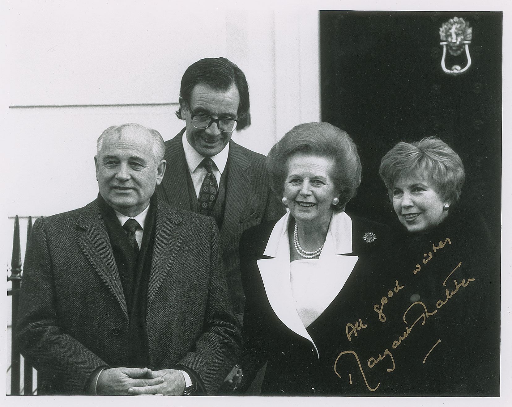 Glossy 10 x 8 photo of Thatcher posing alongside Mikhail and Raisa Gorbachev in 1993, signed in gold ink, "All good wishes, Margaret Thatcher." Reverse bears a copyright stamp for The Guardian. In fine condition, with a small crease near the bottom edge.