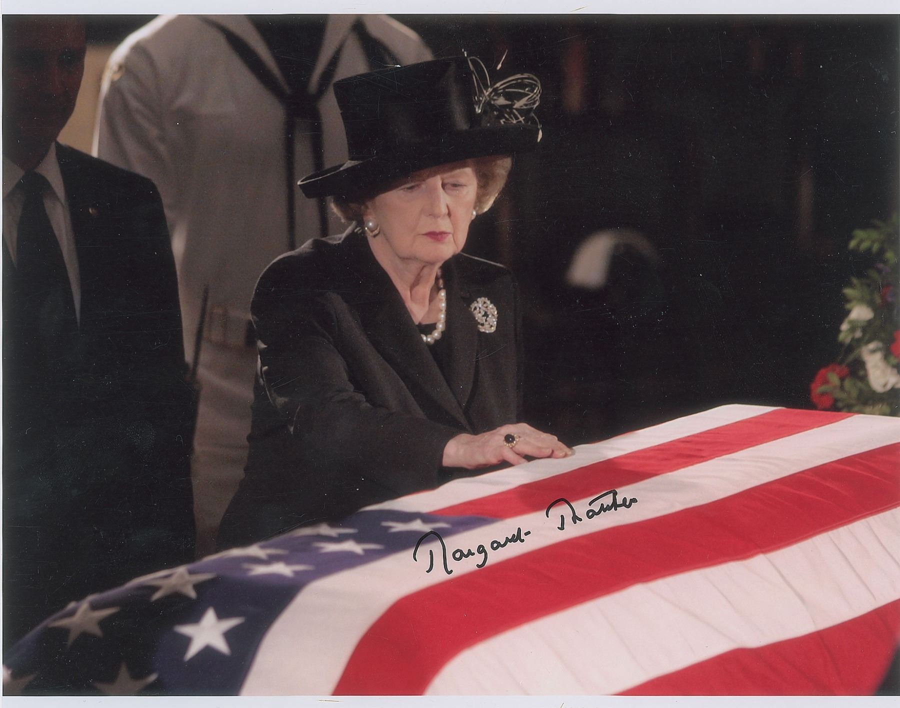 Color glossy 10 x 8 photo of Margaret Thatcher touching the flag-draped coffin of Ronald Reagan, signed in black felt tip. In fine condition.