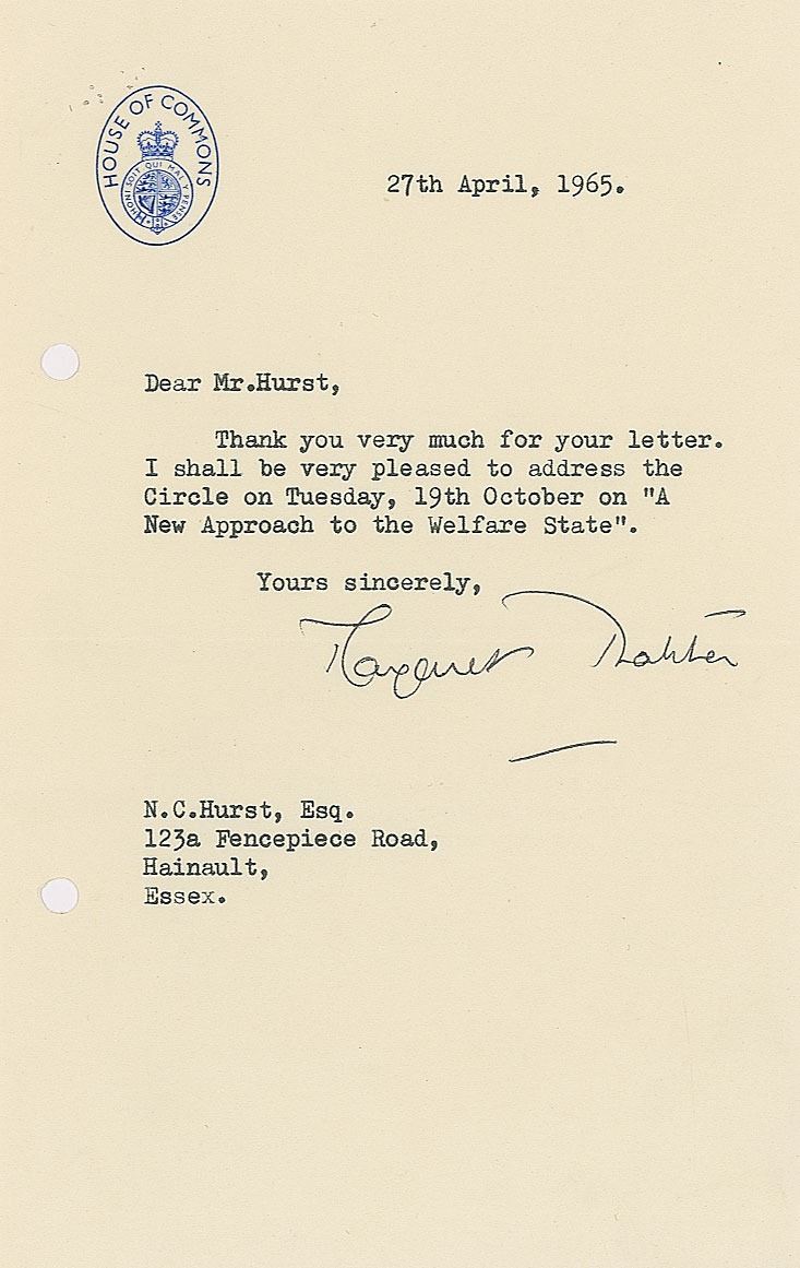 TLS, one page, 4.75 x 7.5, House of Commons letterhead, April 27, 1965. Letter to N. C. Hurst, in full: "Thank you very much for your letter. I shall be very pleased to address the Circle on Tuesday, 19th October on 'A New Approach to the Welfare State.'" In fine condition, with two punch holes to the left edge.