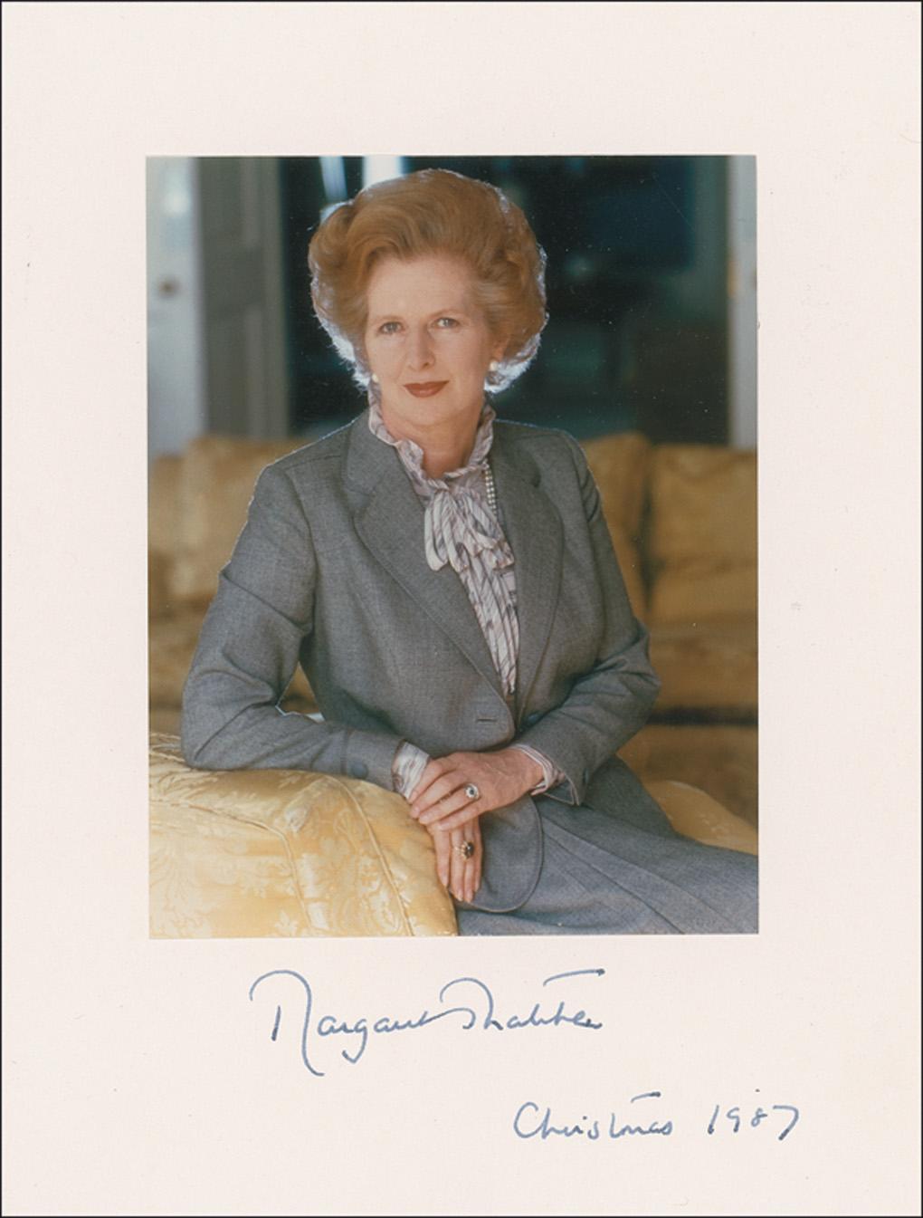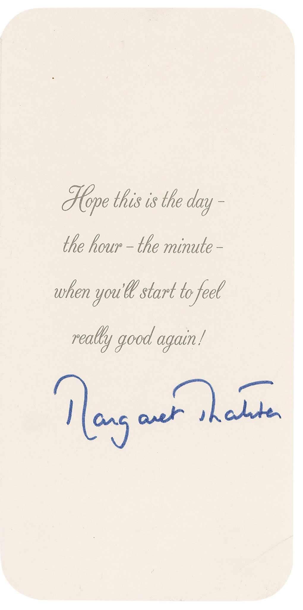 Two items: color satin-finish 4 x 5 photo affixed to a 6 x 8 mount, signed on the mount in black ink, “Margaret Thatcher Christmas 1987”; and a get well greeting card, 3.5 x 7 closed, signed inside in blue felt tip. In fine condition.