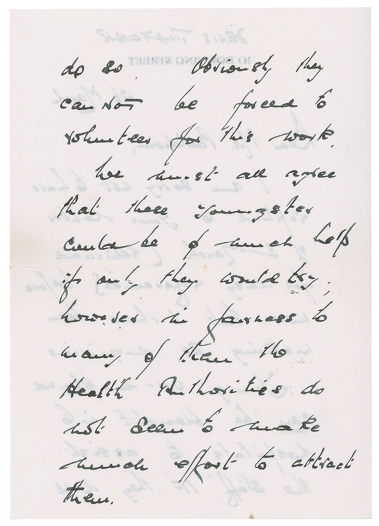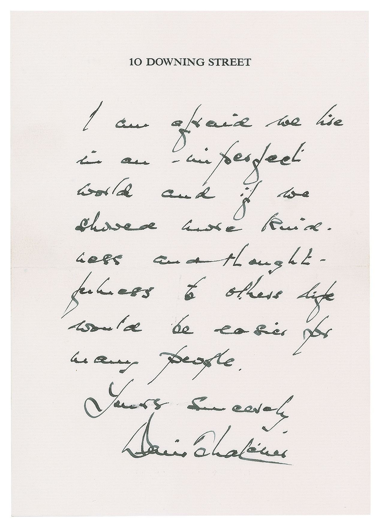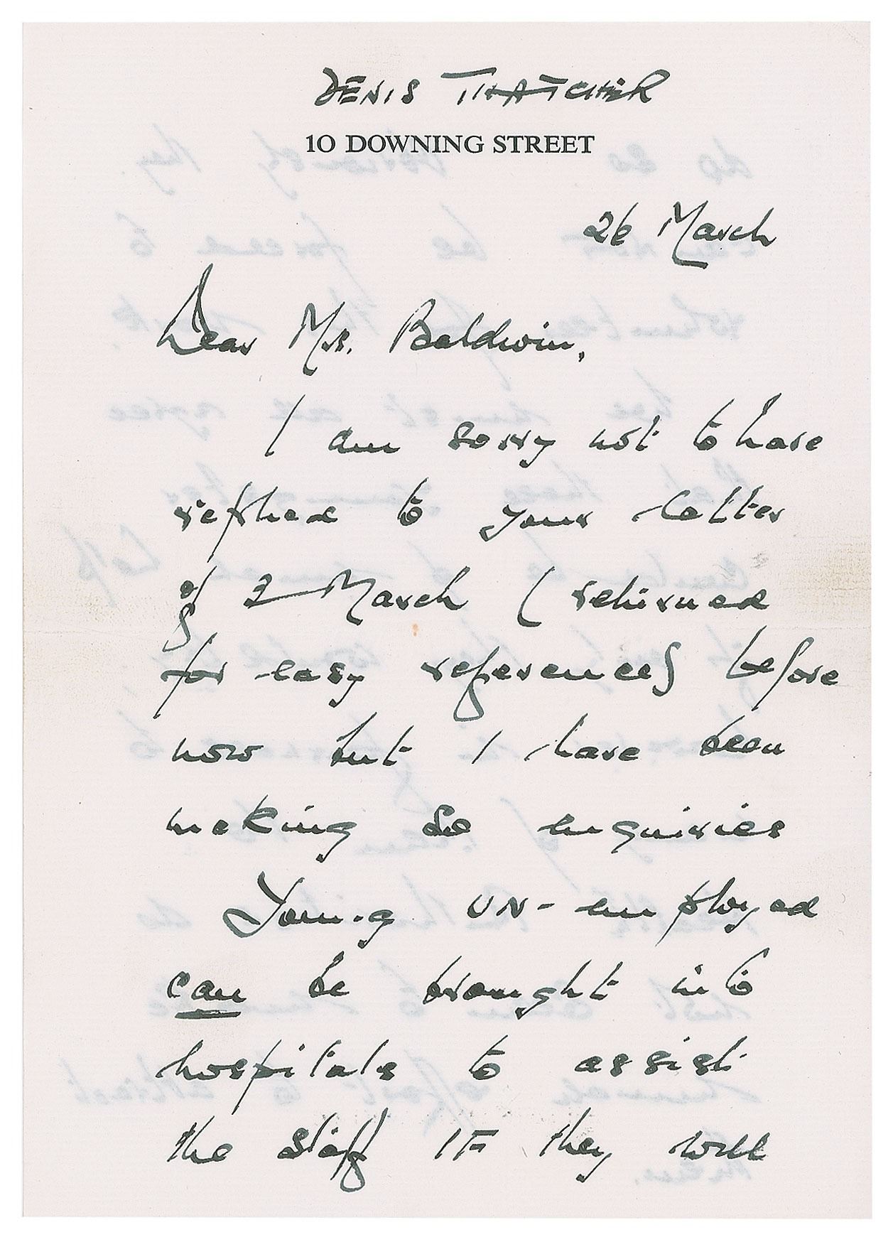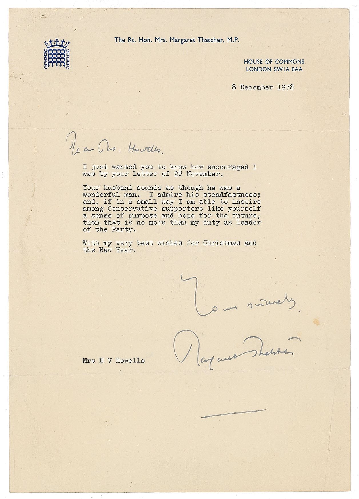 Two letters: a TLS signed "Yours sincerely, Margaret Thatcher," one page, House of Commons letterhead, December 8, 1978, in part: "Your husband sounds as though he was a wonderful man. I admire his steadfastness; and, if in a small way I am able to inspire among Conservative supporters like yourself a sense of purpose and hope for the future, then that is no more than my duty as Leader of the Party"; and an ALS signed "Denis Thatcher," three pages on two sheets, 10 Downing Street letterhead, March 26, [1983], in part: "Young un-employed can be brought into hospitals to assist the staff if they will do so. Obviously they can not be forced to volunteer for this work. We must all agree that the youngster could be of much help if only they would try; however in fairness to many of them the Health Authorities do not seem to make much effort to attract them. I am afraid we live in an imperfect world and if we showed more kindness and thoughtfulness to others life would be easier for many people. In very good to fine condition, with overall creasing the the typed letter. Accompanied by the original mailing envelope for the Denis Thatcher letter, addressed in his own hand.