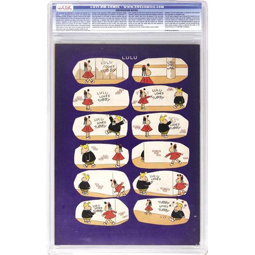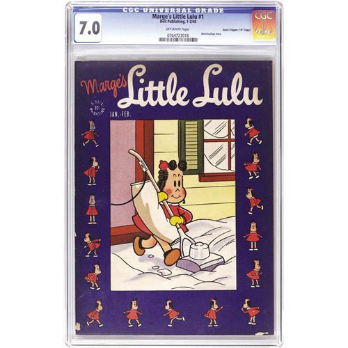 <B>Marge's Little Lulu #1 Davis Crippen ("D" Copy) pedigree (Dell, 1948) CGC FN/VF 7.0 Off-white pages. </B></I> The solid dark-purple cover has made this issue the bane of high-grade Lulu collectors. Well, here's a copy topped by only one other in CGC's census! Overstreet 2006 FN 6.0 value = $165; VF 8.0 value = $451. CGC census 6/06: 1 in 7.0, 1 higher. <I>From the Crippen Collection.</B></I> <BR><BR><B>Important notice:</B> Heritage usually auctions material at the rate of 200-250 lots per hour. On some occasions eBay Live bid software or the Internet may not be able to keep up with the pace of the auction. We recommend placing a realistic absentee bid now as insurance to avoid disappointment. Occasionally the auctioneer may eliminate or reject an eBay Live bid, and the auctioneer may also reopen a lot after the close of the eBay live bidding (usually because we missed an audience bid), and may reject your bid even if it shows you as the winning bidder. By bidding via eBay Live, you agree that Heritage may award the lot to another bidder at its sole discretion under the circumstances described above or any other reasonable circumstances. Since eBay bids are not shown to us until we open the lot on the floor, we treat those bids just like floor bids. In most cases the floor responds before the eBay bid is presented to us, due to Internet lag time, so for consistency we have made it a policy that floor bids are always considered first over tie eBay live bids. Also please note that all Heritage lots purchased through eBay Live carry a 22.5% Buyer's Premium. Please make sure you read the Terms and Conditions before you bid. This lot is being auctioned in conjunction with a live floor auction by Heritage Auction Galleries. All final auction and invoice information will be supplied by Heritage Auction Galleries, and all other information should be considered preliminary. Lot:41001 <BR><BR><B>Winning Notification and Billing:</B> After the FINAL session in this auction is complete, Heritage will send e-mail and snail mail invoices. This process normally takes several days. All final auction and invoice information will be supplied by Heritage Auction Galleries, and all other information should be considered preliminary. <BR><BR>This auction will be conducted on a live auction floor and over the Internet through eBay Live. If you choose to place an absentee bid, please take a moment to <font color='#0000ff'><u><a href='http://pages.ebay.com/liveauctions/help/before/laabsentee.html'>learn how eBay Live absentee bidding works</a></u></font><font color='#000000'>