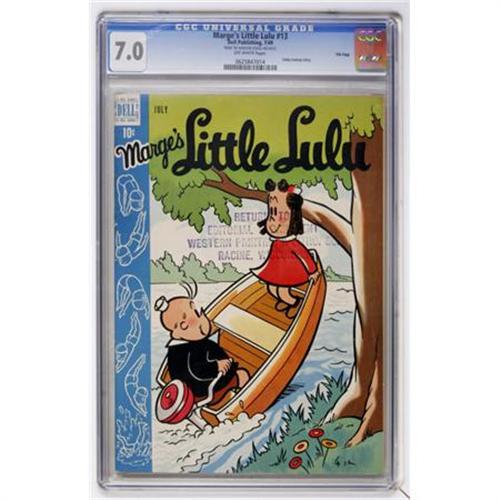 <B>Marge's Little Lulu #13 File Copy (Dell, 1949) CGC FN/VF 7.0 Off-white pages.</B></I> Tubby backup story. Cover bears an editorial department stamp. CGC notes, "From the Random House Archives." Overstreet 2007 FN 6.0 value = $57; VF 8.0 value = $136. CGC census 6/07: 1 in 7.0, 1 higher.<BR><BR><b>Shipping:</b> Comics - Slabbed (certified) (<a target="_blank" href="http://www.heritageauctions.com/common/shipping.php">view shipping information</a>)