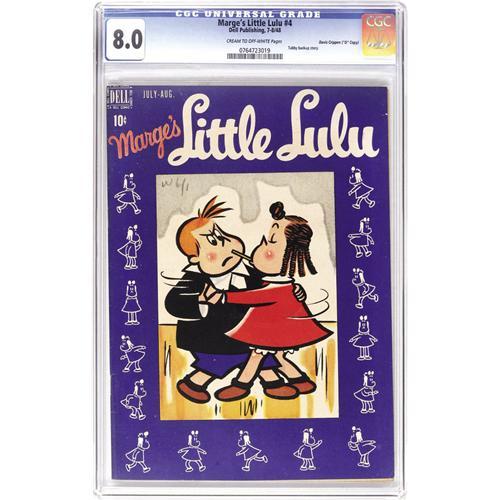<B>Marge's Little Lulu #4 Davis Crippen ("D" Copy) pedigree (Dell, 1948) CGC VF 8.0 Cream to off-white pages.</B></I> The same vexing deep-purple cover color that makes #1 such a pain to find in high grade also affects this issue. Davis Crippen didn't read the comics he bought, but if he had, he would have gotten to enjoy a Tubby backup feature. Overstreet 2006 VF 8.0 value = $203. CGC census 6/06: 1 in 8.0, none higher. <I>From the Crippen Collection.</B></I> <BR><BR><B>Important notice:</B> Heritage usually auctions material at the rate of 200-250 lots per hour. On some occasions eBay Live bid software or the Internet may not be able to keep up with the pace of the auction. We recommend placing a realistic absentee bid now as insurance to avoid disappointment. Occasionally the auctioneer may eliminate or reject an eBay Live bid, and the auctioneer may also reopen a lot after the close of the eBay live bidding (usually because we missed an audience bid), and may reject your bid even if it shows you as the winning bidder. By bidding via eBay Live, you agree that Heritage may award the lot to another bidder at its sole discretion under the circumstances described above or any other reasonable circumstances. Since eBay bids are not shown to us until we open the lot on the floor, we treat those bids just like floor bids. In most cases the floor responds before the eBay bid is presented to us, due to Internet lag time, so for consistency we have made it a policy that floor bids are always considered first over tie eBay live bids. Also please note that all Heritage lots purchased through eBay Live carry a 22.5% Buyer's Premium. Please make sure you read the Terms and Conditions before you bid. This lot is being auctioned in conjunction with a live floor auction by Heritage Auction Galleries. All final auction and invoice information will be supplied by Heritage Auction Galleries, and all other information should be considered preliminary. Lot:41001 <BR><BR><B>Winning Notification and Billing:</B> After the FINAL session in this auction is complete, Heritage will send e-mail and snail mail invoices. This process normally takes several days. All final auction and invoice information will be supplied by Heritage Auction Galleries, and all other information should be considered preliminary. <BR><BR>This auction will be conducted on a live auction floor and over the Internet through eBay Live. If you choose to place an absentee bid, please take a moment to <font color='#0000ff'><u><a href='http://pages.ebay.com/liveauctions/help/before/laabsentee.html'>learn how eBay Live absentee bidding works</a></u></font><font color='#000000'>