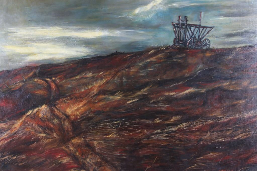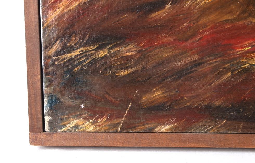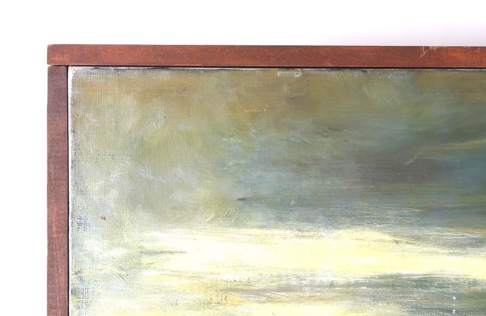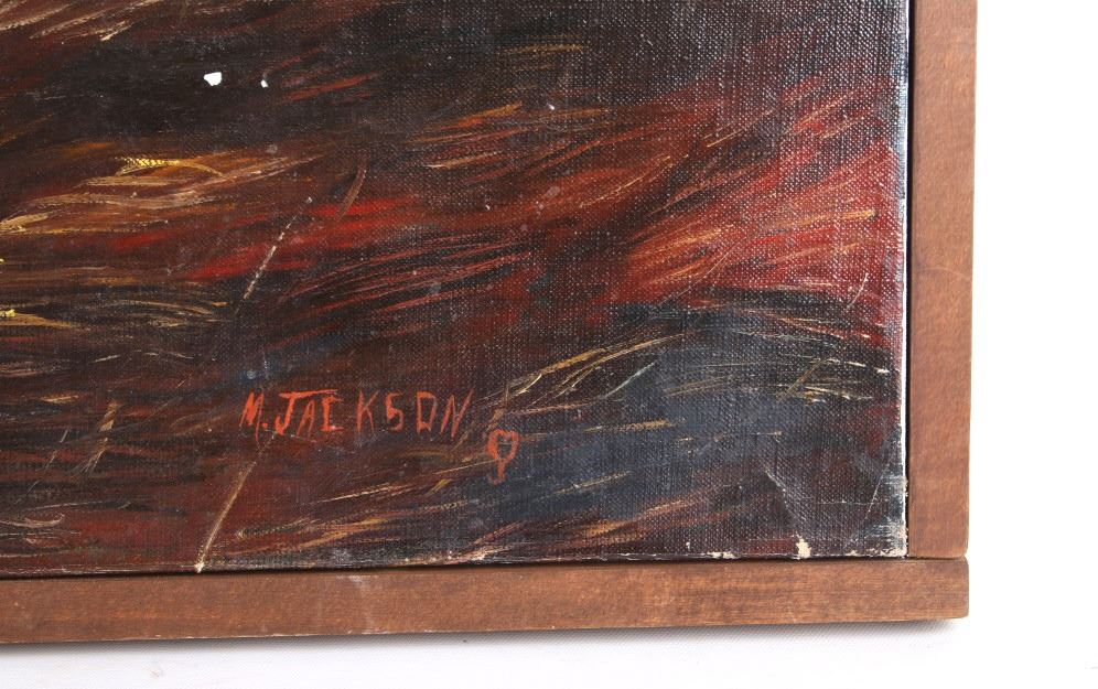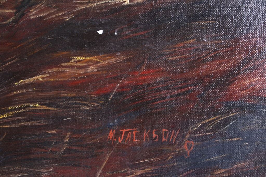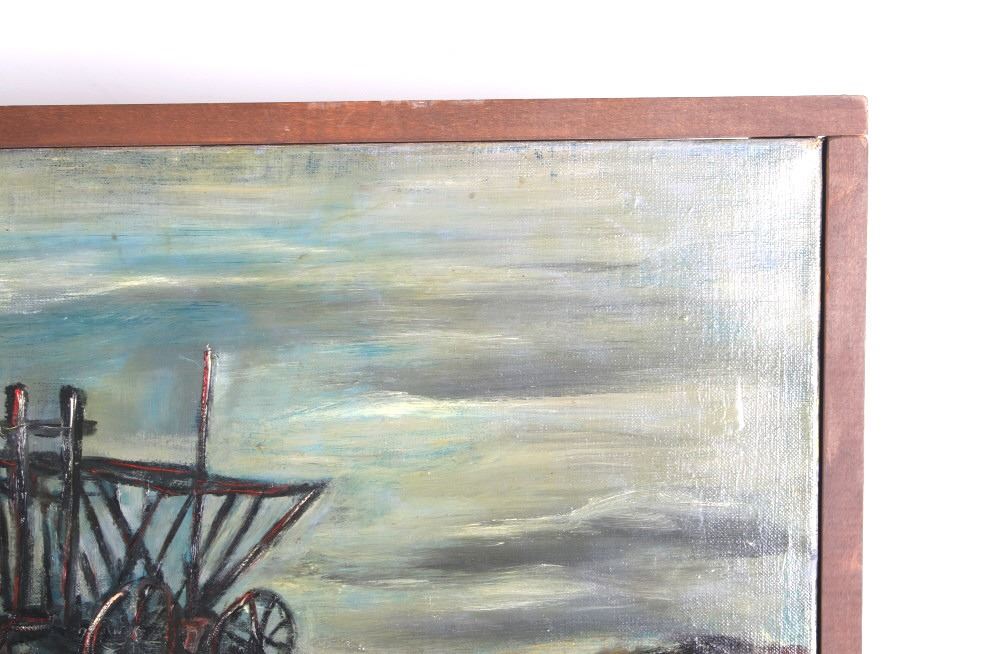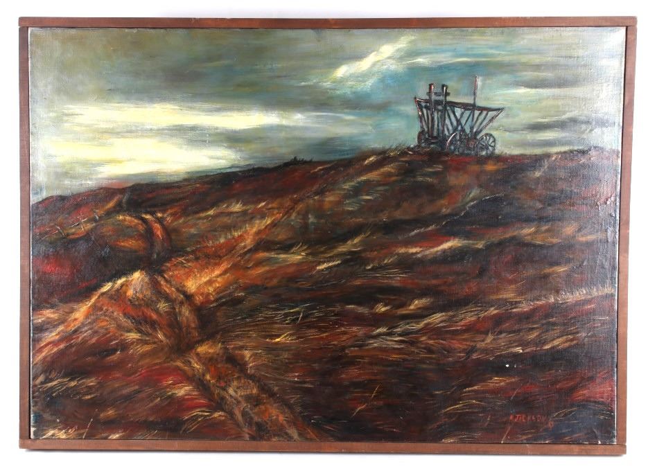 Featured in this lot is this framed oil-on-canvas by Margie Jackson (born 1934 and passed 2021) titled "Fallon Fields." The painting shows a hay cart sitting still atop a hill filled with flowing grass and a boundary fence in the distance. The artist signature can be seen on the bottom right hand side of the piece and the title is pencilled on the back of the artwork. Her experience at casting her creations in bronze began around 1976. Jackson lived on a farm in Yelm, Washington, but grew up in Texas and Oklahoma. Because the range was open and cattle left on their own, they would be prey to packs of wolves and coyotes. Horses were still respected as a means of transportation and the area was plentiful with Native Americans still richly steeped in their own culture, lending to the inspiration of her work. Among her numerous awards are Best of Show-Sculpture at the Celebration of Western Art Show in Olympia, Washington and First and Second places at the 1986 and 1987 Arizona Annual Art Shows. She was commissioned to create bronze and limited-edition prints celebrating the Washington State Centennial; the city of Yelm purchased one of these pieces for installation in the City Hall. The condition of this framed oil-on-canvas is good, with some slight wear to the frame. The measurements of this oil on canvas are 29 1/2" x 41 3/8" and the visible art measures 28" x 40". Provenance: This is from the personal Artist Margie Jackson.