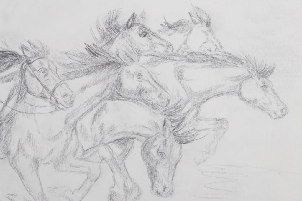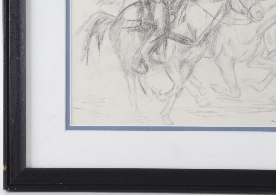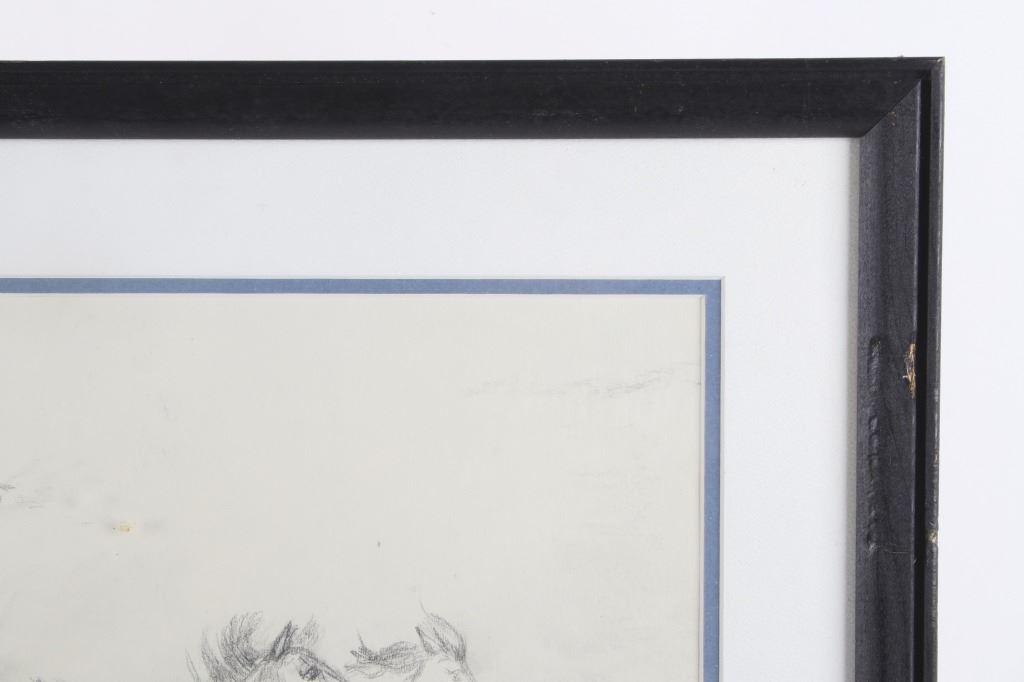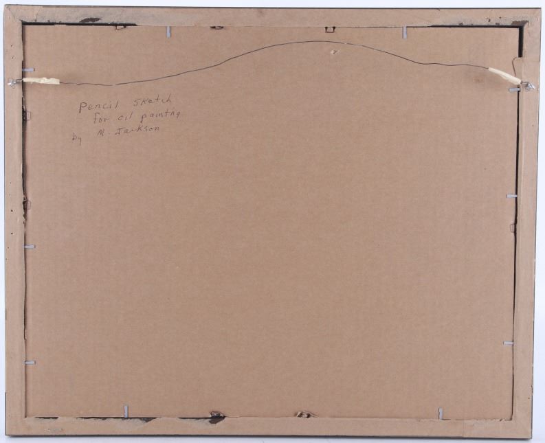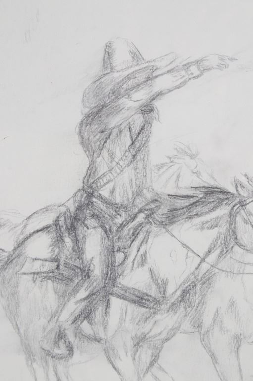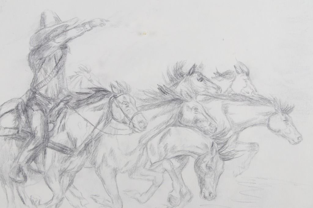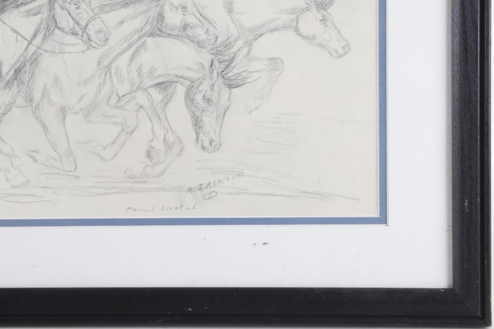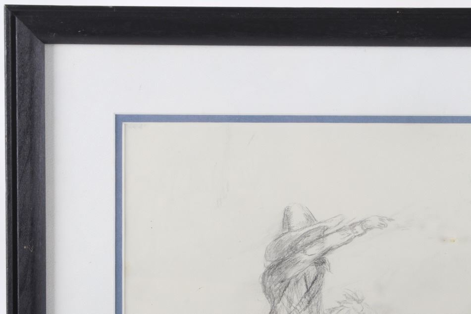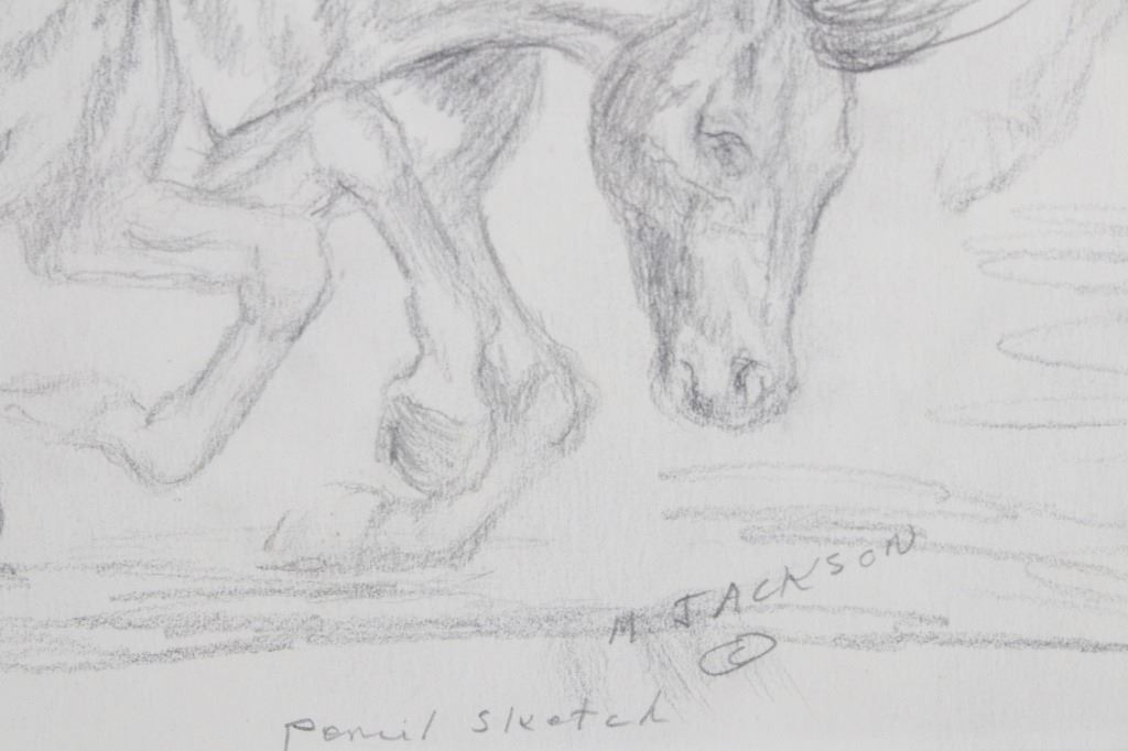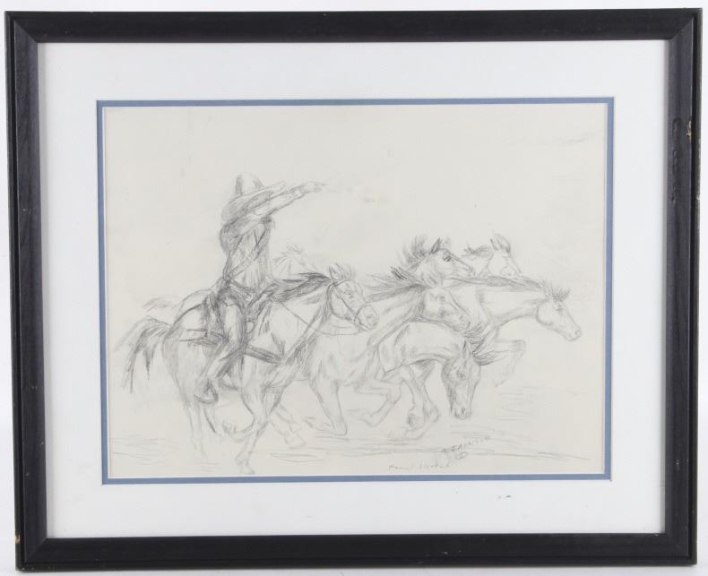 Featured in this lot is a framed pencil sketch of an oil painting from Margie Jackson (born 1934 and passed 2021). The pencil sketch shows a cowboy rounding up a herd of horses and galloping alongside them. The artist’s signature is shown in the bottom right-hand corner, along with the identifying mark 'Pencil Sketch.' Margie Jackson (1934-2021) was a painter for years before she became a sculptor. Her experience at casting her creations in bronze began around 1976. Jackson lived on a farm in Yelm, Washington, she but grew up in Texas and Oklahoma. Because the range was open and cattle left on their own, they would be prey to packs of wolves and coyotes. Horses were still respected as a means of transportation and the area was plentiful with Native Americans still richly steeped in their own culture, lending to the inspiration of her work. Among her numerous awards are Best of Show-Sculpture at the Celebration of Western Art Show in Olympia, Washington and First and Second places at the 1986 and 1987 Arizona Annual Art Shows. She was commissioned to create bronze and limited-edition prints celebrating the Washington State Centennial; the city of Yelm purchased one of these pieces for installation in the City Hall. The condition of this pencil sketch is good, with some wear to the frame, but the pencil sketch is well preserved behind a display case. The measurements of this framed pencil sketch are 17 3/4" x 21 3/4" and the visible art measures 11 3/4" x 15 3/4". Provenance: This is from the personal artist Margie Jackson.
