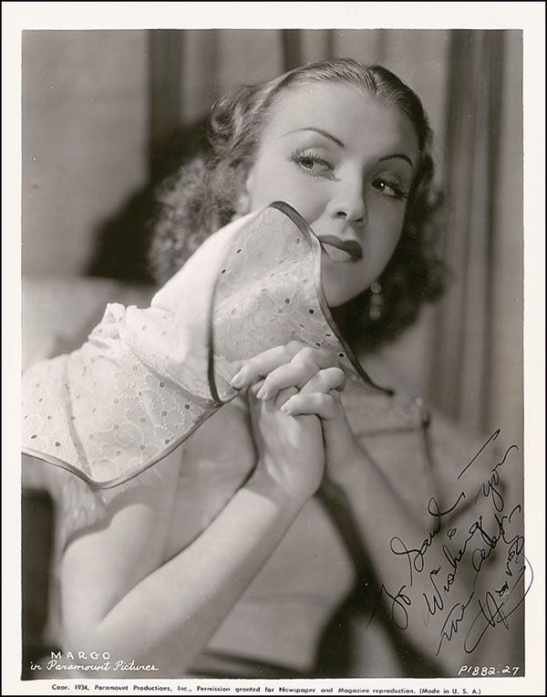 Vintage glossy 8 x 10 Paramount Pictures publicity photo of Margo in a large collar, signed and inscribed in-person in fountain pen “To Saul – Wishing you the best, Margo.” Reverse of photo bears collector’s stamp date of March 5, 1935, the date the signature was acquired. In very good condition, with scattered creases, impressions and surface marks and scattered rippling to emulsion. The Saul Goodman collection.