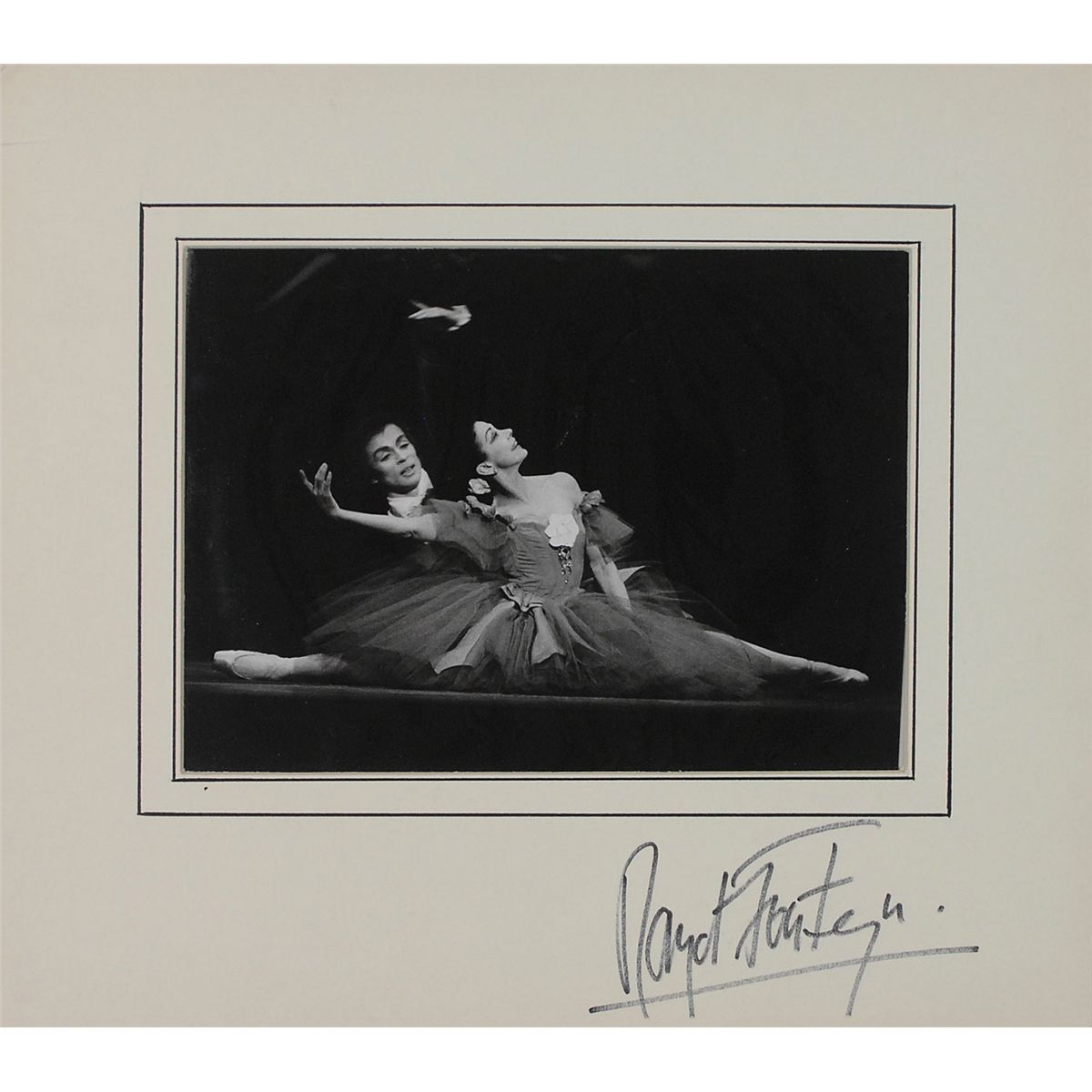 Satin-finish 9.75 x 7 photo of Fonteyn performing with Rudolf Nureyev matted to an overall size of 15 x 13, signed on the mat in thick black felt tip by Fonteyn. In fine condition.