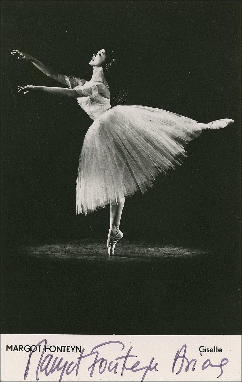 Glossy 3.5 x 5.5 photo of Fonteyn as Giselle, signed in the lower border in black felt tip, “Margot Fonteyn Arias.” In very good condition, with a couple stamp impressions to left side.