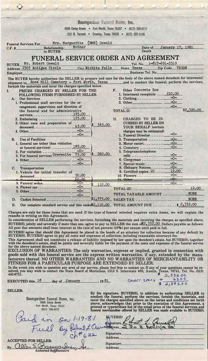 Robert Oswald signed copy of the funeral service agreement for his mother Marguerite Oswald. Agreement itemizes the list of expenses for her burial, totaling $2,332 which is noted as being ''Paid in Full on 1-19-81 by Robert L. Oswald''. 8.5'' x 14.5'' document with duplicate carbon copy still attached, is in near fine condition. Accompanied by a Letter of Authenticity from Funeral Director Allen Baumgardner, whose company oversaw both Marguerite Oswald and Lee Harvey Oswald's burials.