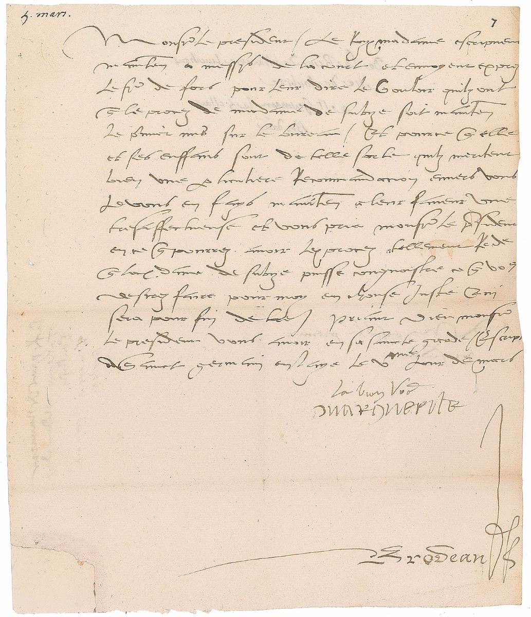 Sister of King Francis I of France (1492–1549), also known as Marguerite of Navarre, who was a major author and patron of the French Renaissance; Samuel Putnam called her the 'First Modern Woman.' LS in French, signed with autograph subscription “your good friend, Marguerite,” one page, 8 x 9.25, Saint-Germain-en-Laye, March 5, 1523, countersigned by chancellor Victor Brodeau, address on verso. To the first President of the Parliament of Paris Jean de Selve to recommended particular attention to the case of Madame de Soubize, whose file “should be the first to be put over your desk.” In fine condition, with trimmed edges, tiny binding holes along left edge, and an area of repaired paper loss to lower left corner. An extremely rare French literary and historical autograph.