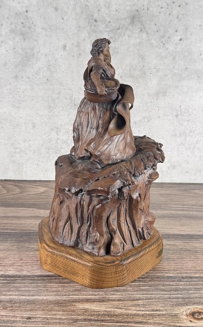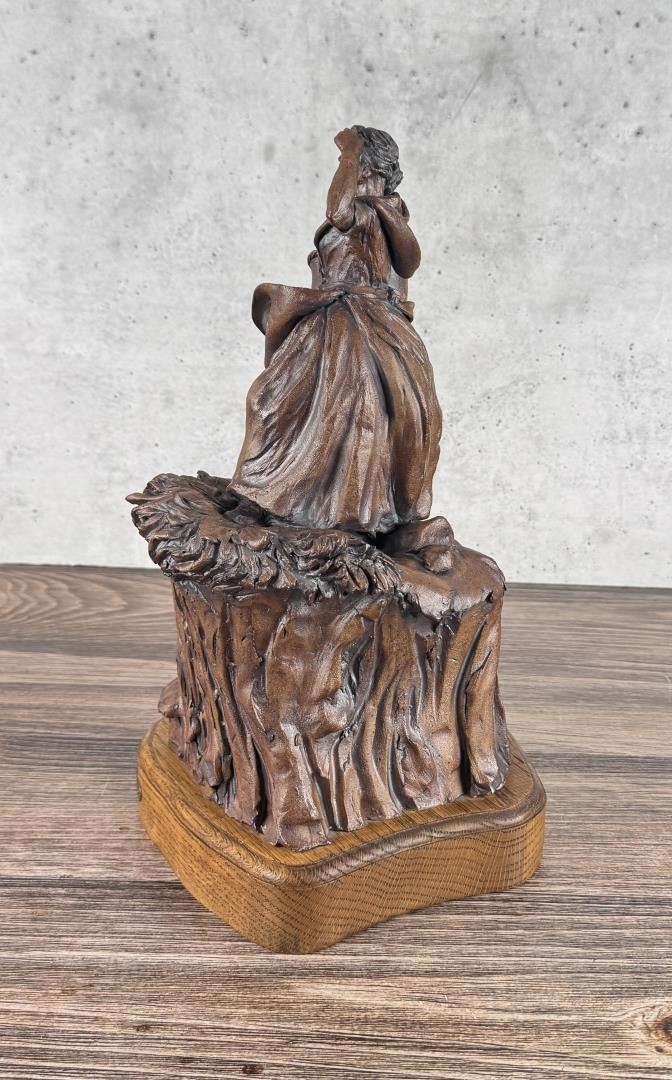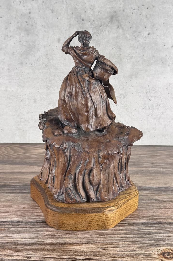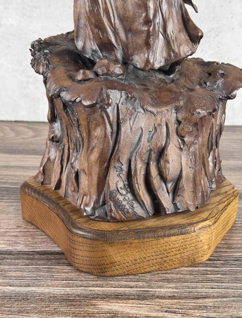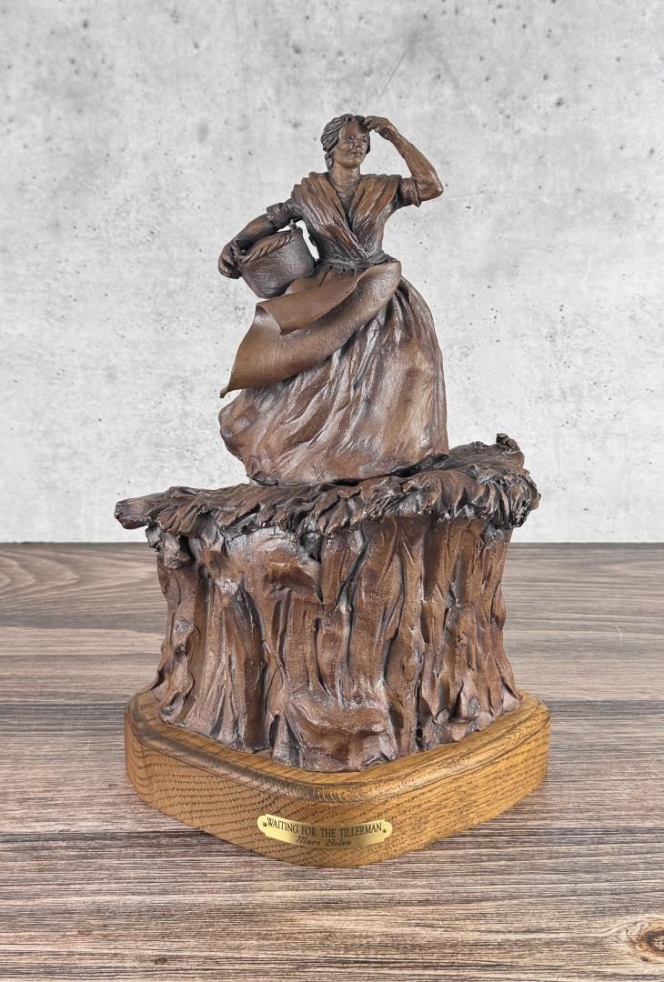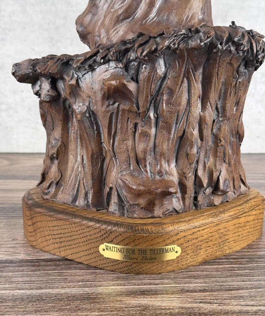 Title is Waiting for the Tillerman. 15" by 9 1/2" by 9". Mari Bolen (Born 1944) is active/lives in Montana. Mari Bolen is known for Sculptor-Indian, figure and portrait. The following is from the artist: Born in Great Falls, Montana, and living in Hamilton, Montana, Mari Bolen has been a professional artist since 1964. She has been an illustrator for the Department of Fish and Game, MSU, and an Educational and Commercial TV Art Director in California and Arizona. She taught sculpture for the University of California and San Jose Unified Schools, night classes. In 1980, she returned to Montana to a full-time sculpture career. She is noted for her figurative and portrait work, most notably Plains Indians and others encountered on the Lewis and Clark Expedition. She is a founder of the Montana Professional Artists Association, which she serves as president. She has won People's Choice and best of Show six times from this organization's shows and others.