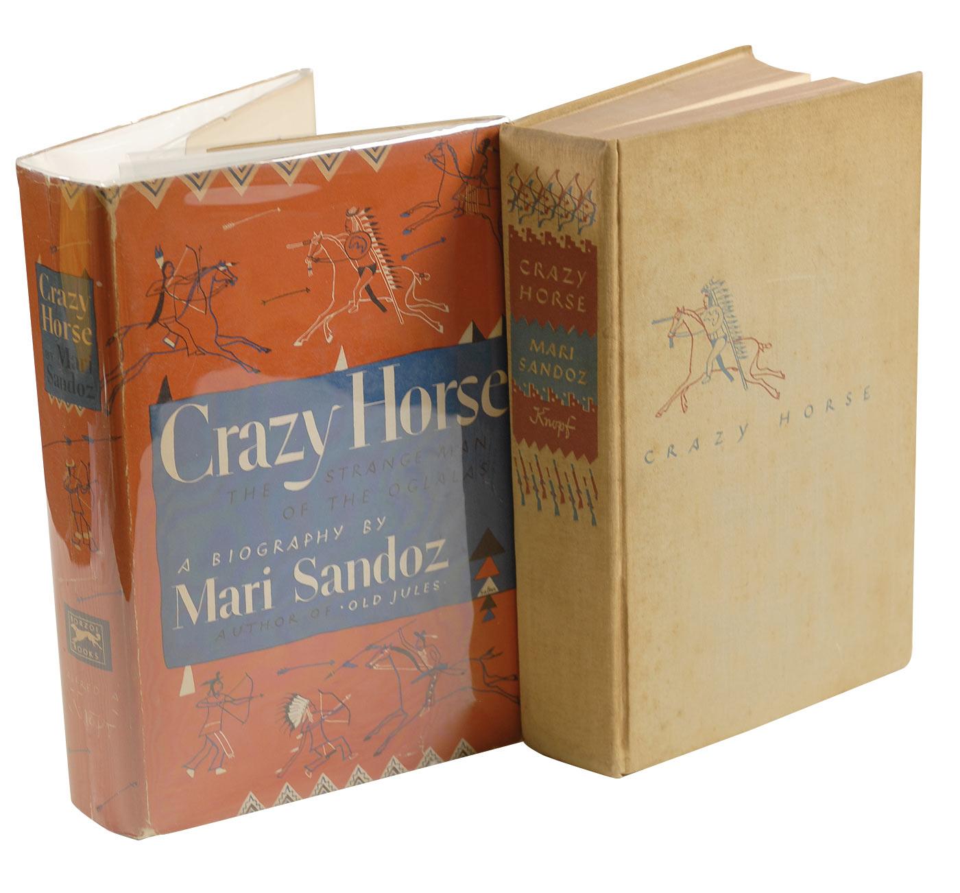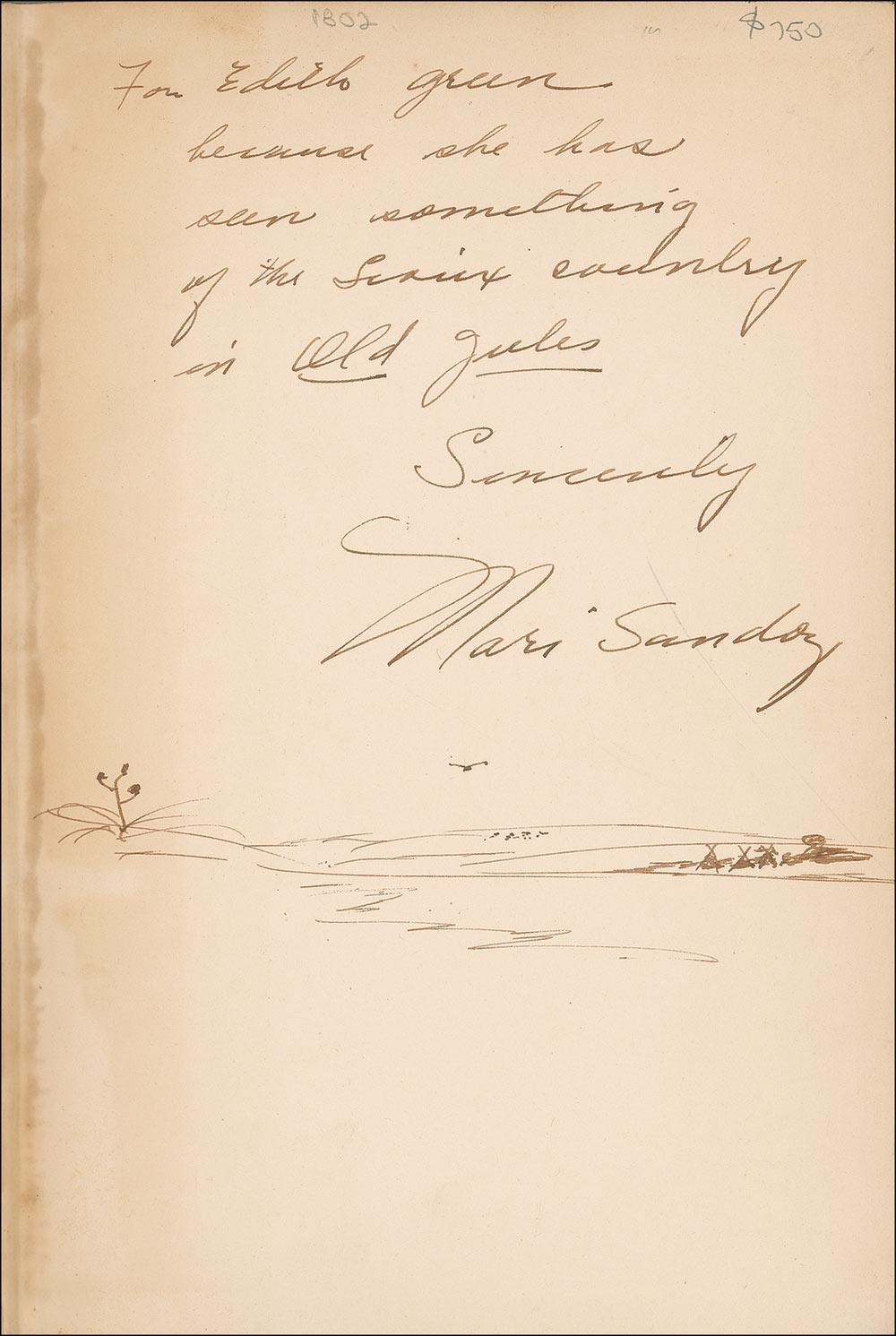 Novelist, biographer, lecturer, and teacher (1896-1966). Signed book: Crazy Horse: The Strange Man of the Oglalas. First edition, first printing. NY: Alfred A. Knopf, 1942. Hardcover with dustjacket, 6 x 9, 428 pages. Signed and inscribed on the first free end page, “For Edeilo Green–because she has seen something of the Sioux country in Old Jules, Sincerely, Mari Sandoz,” adding a small landscape sketch under her signature. In very good condition, with uniform toning and pencil notation to signed page, with a heavier strip of toning along left edge, moderate toning to pastedowns, and foxing, soiling, and areas of damp staining to boards and spine (moderate staining to spine). Dustjacket shows scattered wear and toning.