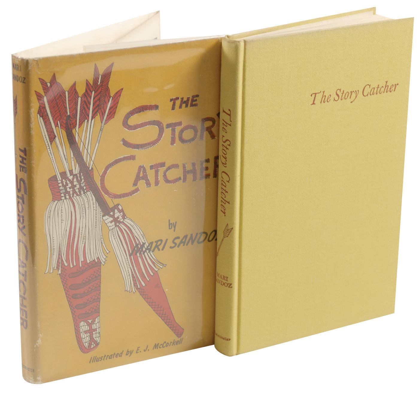 Signed book: The Story Catcher. First edition, first printing. Philadelphia: Westminster Press, 1963. Hardcover with dustjacket, 5.75 x 9, 175 pages. Signed and inscribed on the first free end page, “To Bill, with best wishes, Mari Sandoz, Sept 12, 1963,” adding what appears to be a quick and small landscape sketch under her signature. In fine condition, with pencil notation and a touch of soiling to signed page, erased notation to back pastedown. Dustjacket is price clipped, and shows scattered light wear, creasing and soiling.