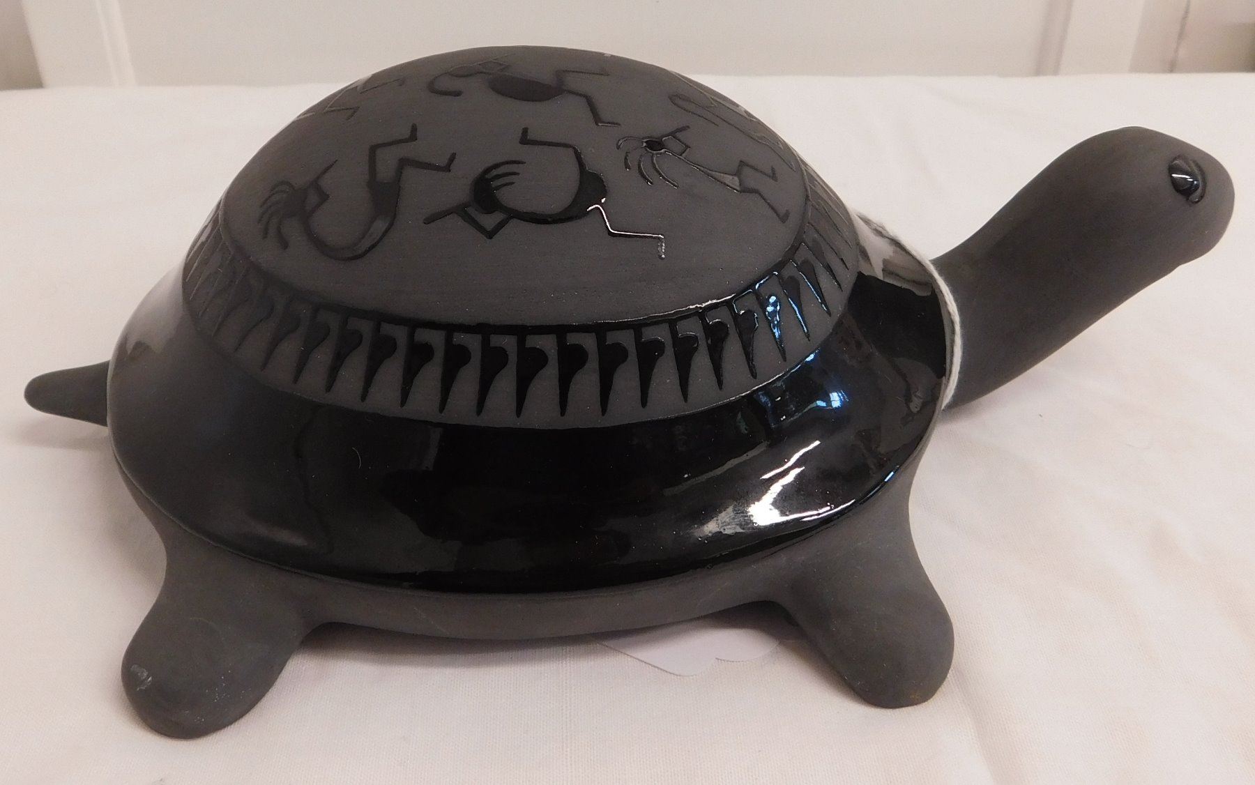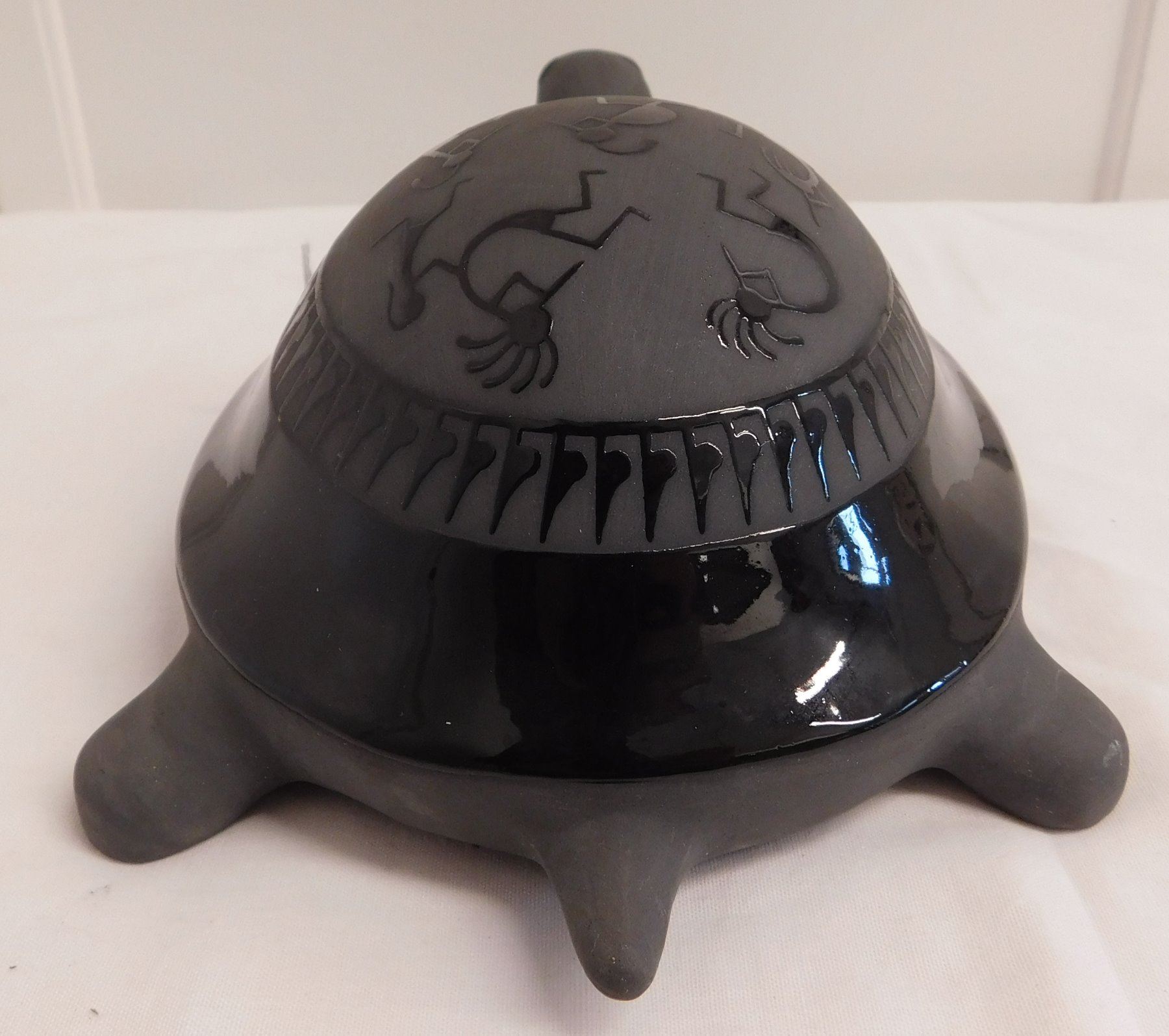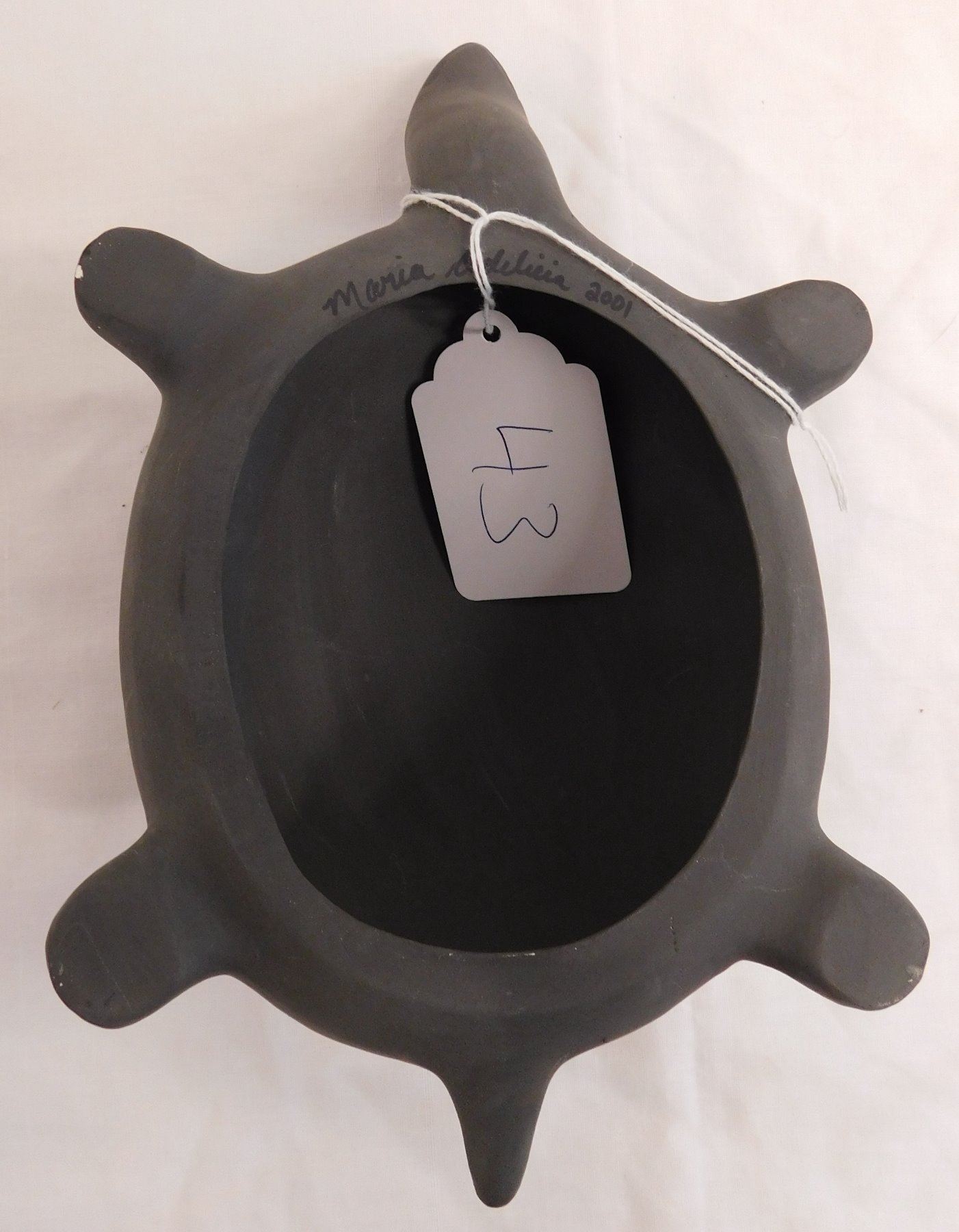 Maria Adelicia Pottery Turtle, 2001. Made of clay and paint, the item measures 10.5" x 6" x 3.5". San Juan Pueblo, New Mexico. Fantastic example of black on black, pueblo pottery for any collection. Kokopelli figures on shell. Condition: Good, see images. Shipping: $25.50 w/insurance and signature.