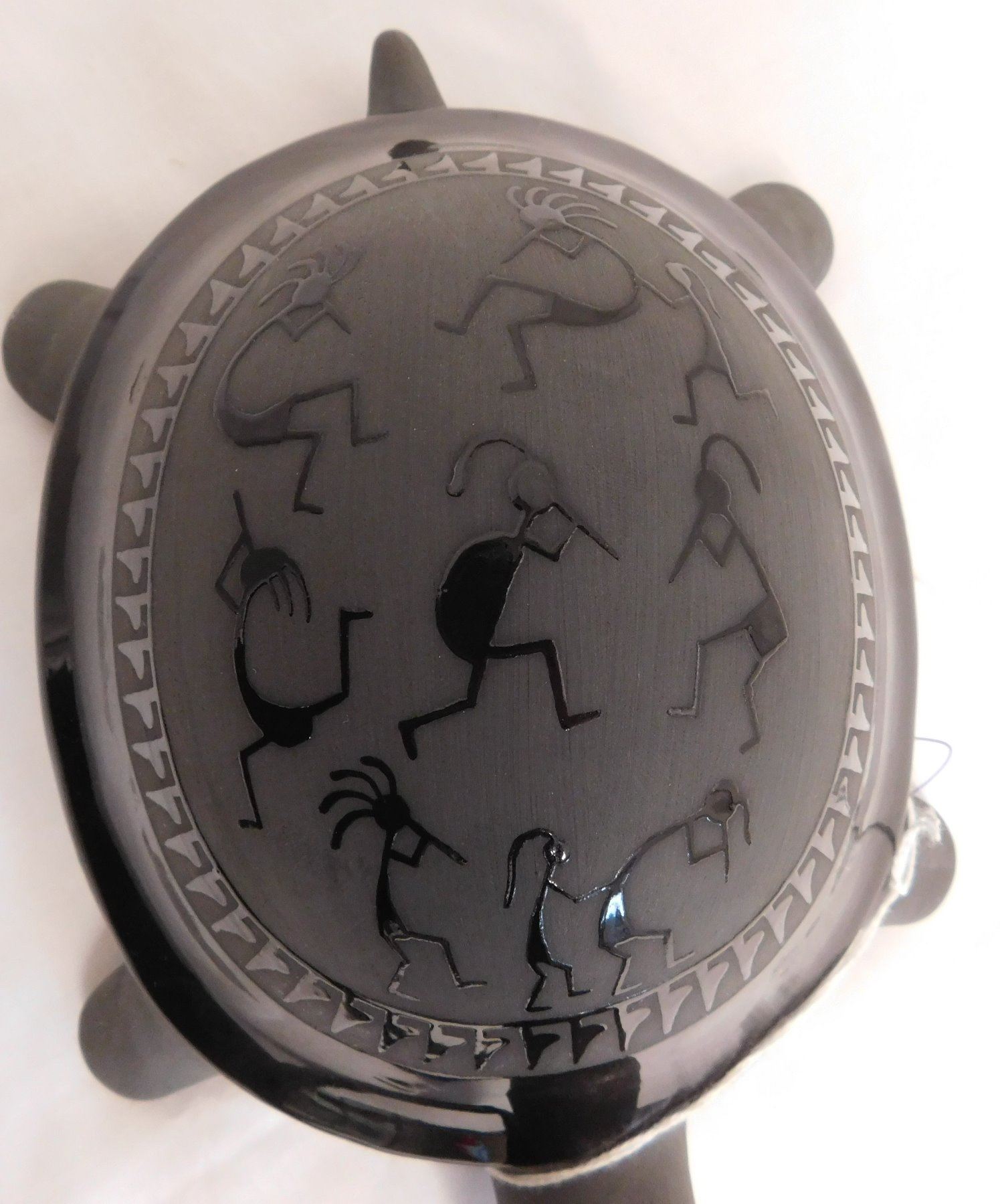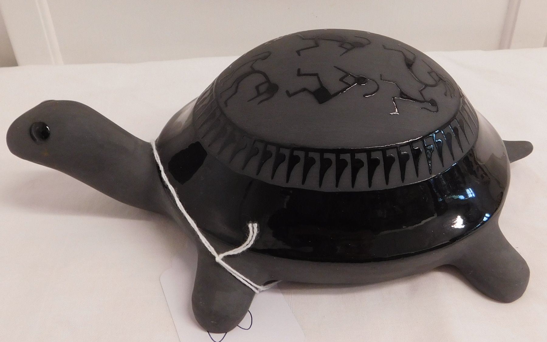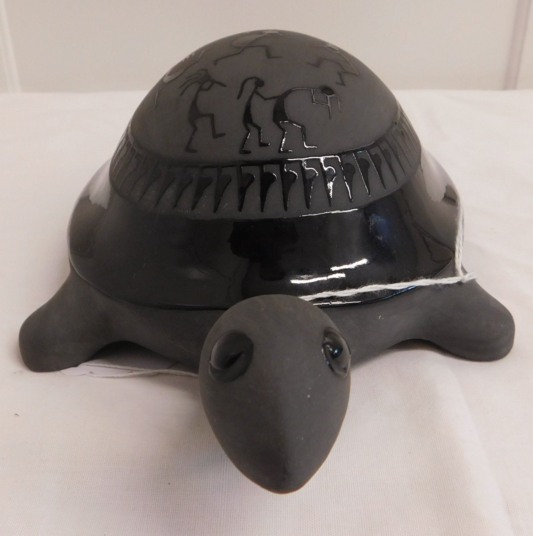 Maria Adelicia Pottery Turtle, 2001. Made of clay and paint, the item measures 10.5" x 6" x 3.5". San Juan Pueblo, New Mexico. Fantastic example of black on black, pueblo pottery for any collection. Kokopelli figures on shell. Condition: Good, see images. Shipping: $25.50 w/insurance and signature.