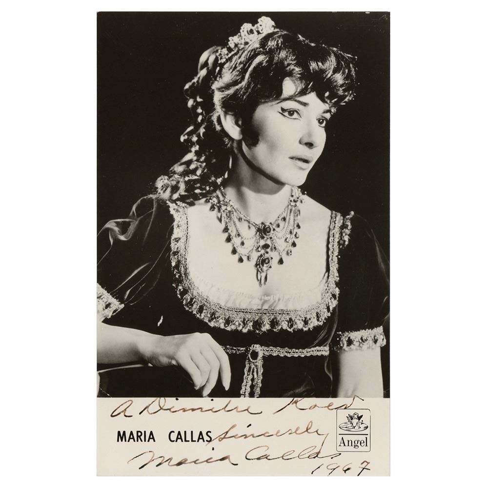 Vintage glossy 4.5 x 7 Angel Records promo photo of Callas in costume, signed and inscribed in the lower border in fountain pen, "A Dimitre Koen, Sincerely, Maria Callas, 1967.‰Û In fine condition, with small creases to the top edge.