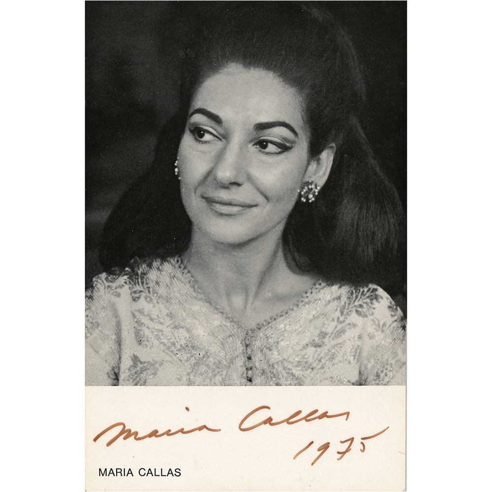 Lovely semi-glossy 3.75 x 5.75 promotional photo of the renowned soprano, signed in the lower border in black felt tip, "Maria Callas, 1975." In fine condition, with a faint postal impression to the right edge.