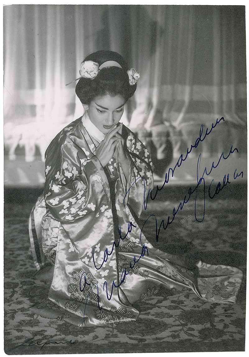 Matte-finish 4 x 5.75 photo of Callas in a Japanese costume, perhaps from Madame Butterfly, signed and inscribed in blue ink “A Carla Moraudun, Maria Meneghini Callas.” In fine condition, with a lightly trimmed right edge.