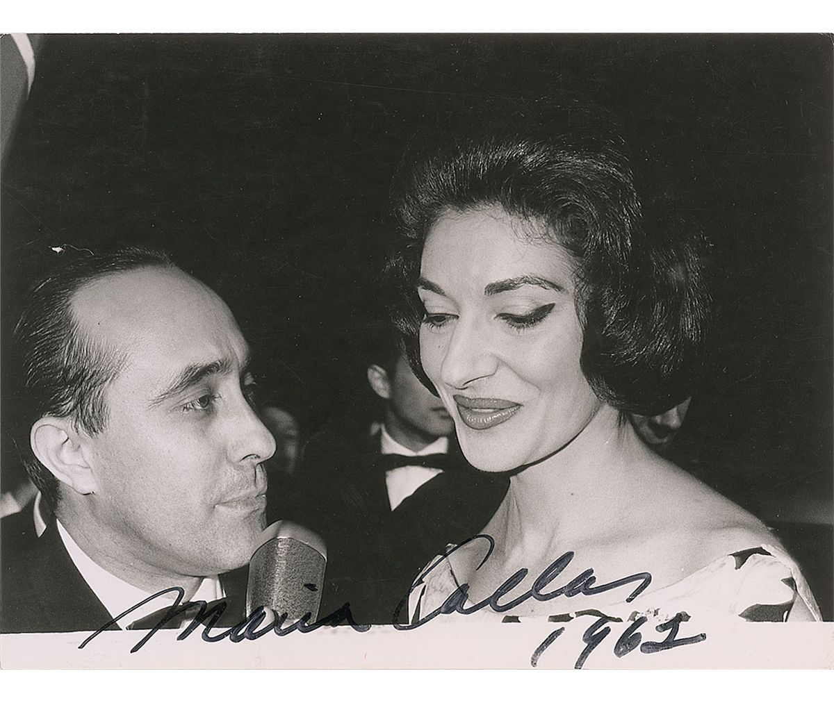 Glossy 9.5 x 7 photo of Callas with a journalist in France, signed in black felt tip, “Maria Callas, 1962.” In very good condition, with scattered surface creases, impressions, and spotting, light rippling to the bottom edge, and lightly trimmed edges.