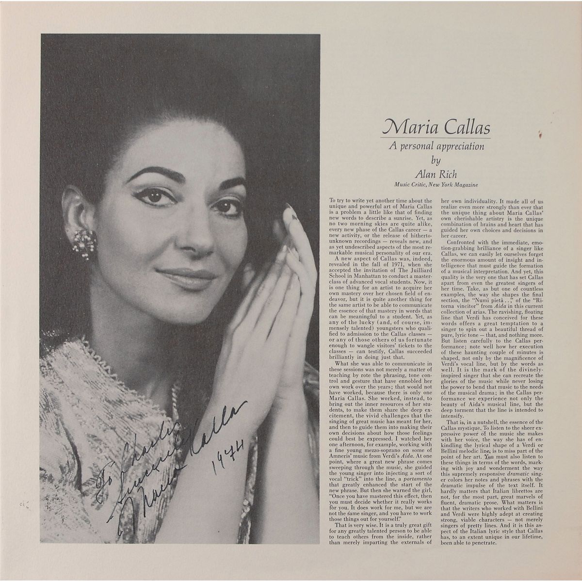 Program honoring Callas featuring lyrics to her songs, 11.25 x 11.5, two pages, signed and inscribed on her image on the front in black felt tip, “To Charles, Sincerely, Maria Callas, 1974.” In fine condition.