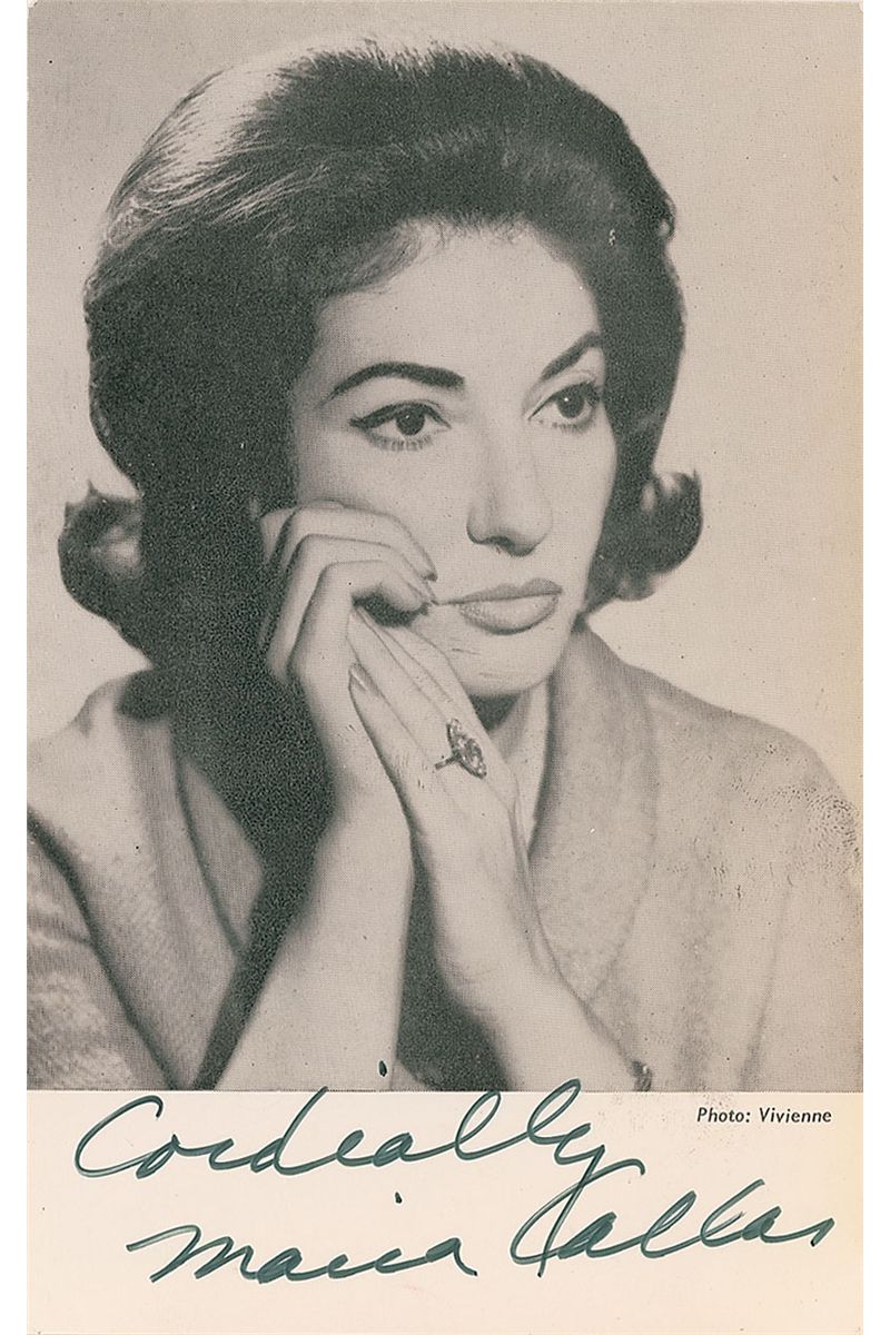 Uncommon and desirable 3.5 x 5.75 cardstock head-and-shoulders photo, signed in the lower border in black felt tip, “Cordially, Maria Callas.” In fine condition.