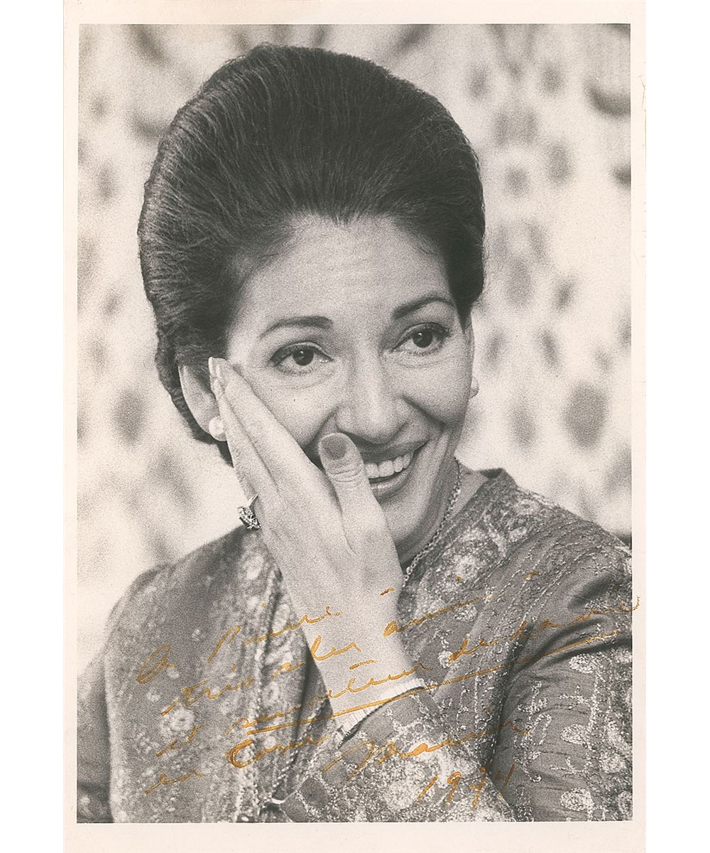 Uncommon matte-finish 6.25 x 9.25 photo of Callas smiling in a candid pose, signed and inscribed to a friend in yellow felt tip, and dated 1974. Inscription and signature a few shades light, otherwise fine condition.