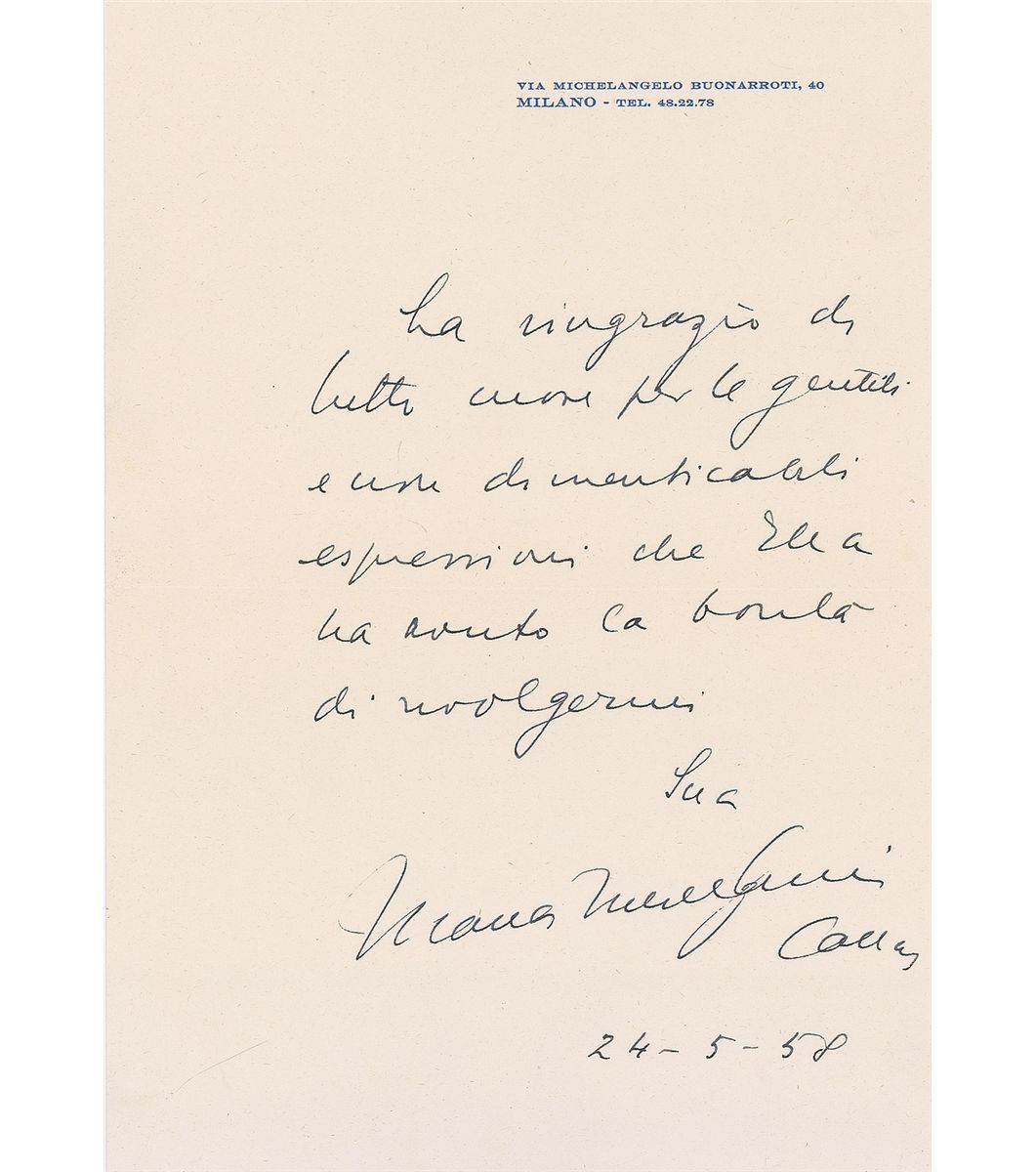 Untranslated ALS in Italian, signed “Maria Meneghini Callas,” one page, 5.75 x 8.25, personal letterhead, May 24, 1958. In fine condition.
