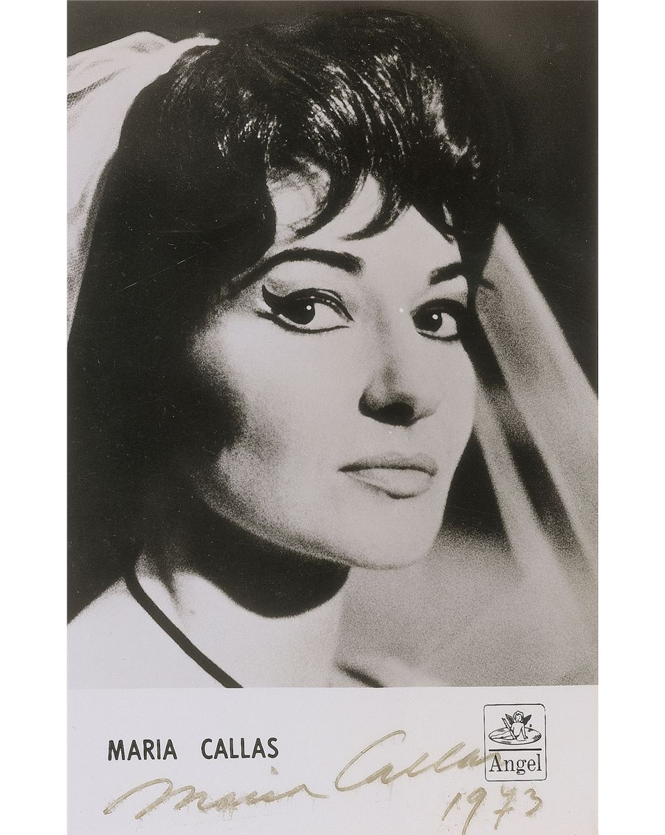 Pretty glossy 4.5 x 7 publicity photo of the renowned soprano, signed in the lower border in black felt tip, “Maria Callas, 1973.” Some brushing and irregular adhesion to ink, otherwise fine condition.