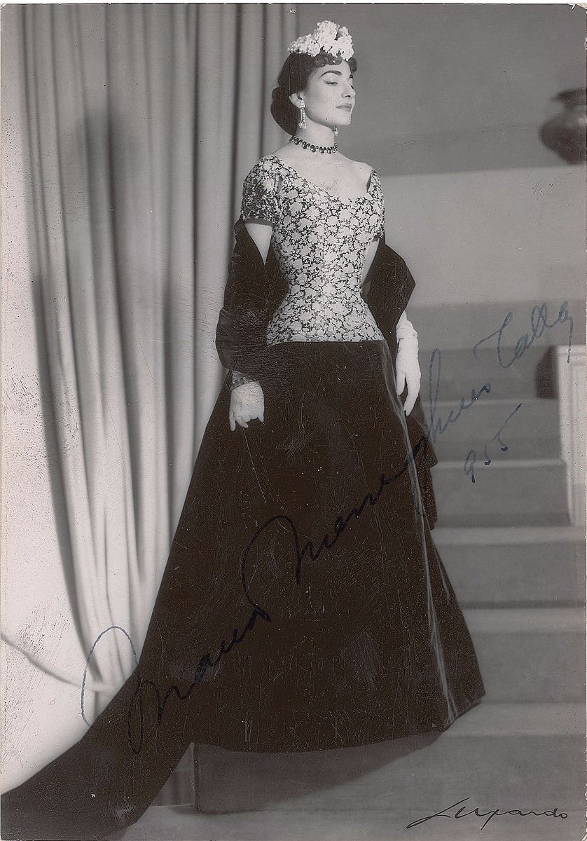 Vintage glossy 4 x 5.75 full-length Luxardo photo of Callas as Puccini’s Tosca, signed in fountain pen, “Maria Meneghini Callas 955.” Reverse bears a ‘Foto Luxardo’ stamp. In fine condition. Accompanied by a full letter of authenticity from JSA.