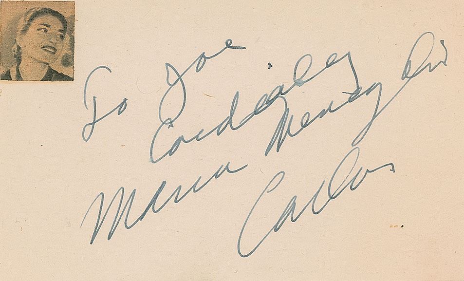 Vintage fountain pen signature and inscription, "To Joe, Cordially, Maria Meneghini Callas,” on an off-white 5 x 3 card bearing a small affixed portrait. Notation on the reverse dates the signature to December 15, 1956. In very fine condition. Originally obtained in person by a New York autograph collector who collected from the 1950s through the 2000s.