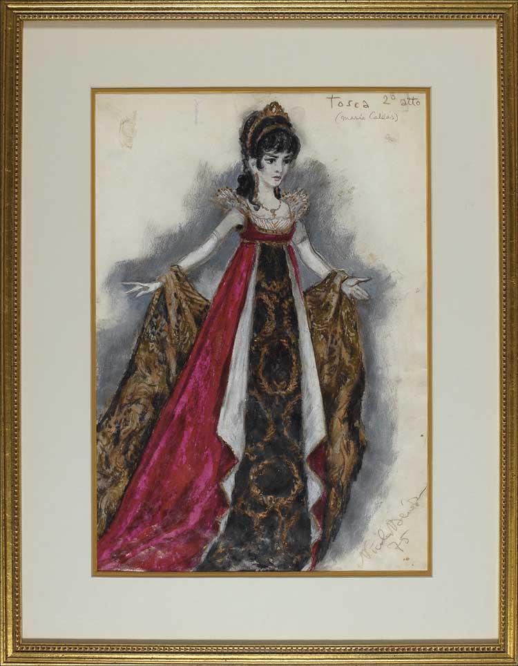 Three items: an oversized matte-finish 10 x 13 photo of Callas in her last performance of Tosca at London’s Covent Garden on February 9, 1964, signed and inscribed in black felt tip, “To Bob Tollett, with all best wishes, Maria Callas 1970.” Cloth matted and framed to an overall size of 17 x 20.5. Secondly, an original full-length color mixed-media sketch of Callas in costume in the second act of Tosca, titled by Nicola Benois at the upper right “Tosca 2¡ atto (Maria Callas),” and signed by him 11 years later, “Nicola Benois 75.” Double matted and framed to an overall size of 20.5 x 26.25. Thirdly, another original full-length color mixed-media sketch of Callas in costume in the third act of Tosca, titled by Benois “Tosca III atto,” and also signed later, “Nicola Benois 75,” and also double matted and framed to an overall size of 20.5 x 26.25. In fine condition, with Callas’s signature and inscription a few shades light, but completely legible. Pre-certified PSA/DNA and RRAuction COA.