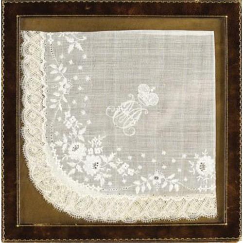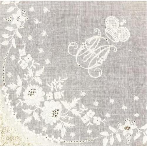 <B>Imperial Russian Empress Maria Fedorovna Linen Handkerchief</B></I><BR><I>Circa 1890</B></I><BR><BR>Of fine transparent white gauze folded in quarters, the corner embroidered with the crowned entwined initials <I>MF, </B></I>for Empress Maria Fedorovna (1847-1928) with lace border enhanced with embroidered floral sprays and garlands-7 x 6 3/4 folded, within later brown leather portfolio frame <BR><BR>Provenance:<BR>Purchased from the Armory Show, New York<BR><BR><b>Shipping:</b> Requires 3rd Party Shipping (<a target="_blank" href="http://www.heritageauctions.com/common/shipping.php">view shipping information</a>)