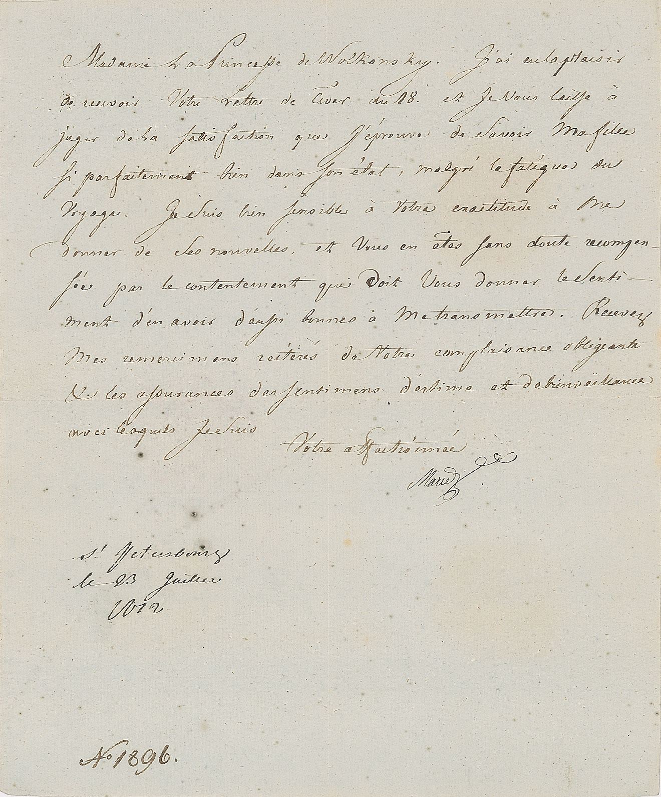 Second wife of Tsar Paul I of Russia and mother of Tsar Alexander I and Tsar Nicholas I of Russia (1759-1828). LS in French, signed “Maria,” one page, 7.25 x 8.75, July 23, 1812. Written while Dowager Empress, a letter to "Madame the Princess of Wolkonsky, which reads, in part (translated): "I have had the pleasure of receiving your letter of the 18th from Tiver, and you may well imagine how gratifying it was to learn that my daughter is feeling so perfectly well, in spite of the fatigue of the voyage. I am very appreciative of your solicitousness in providing me with news of her. In turn, you must derive satisfaction from the fact that you have such good news to convey to me." In fine condition, with intersecting folds.