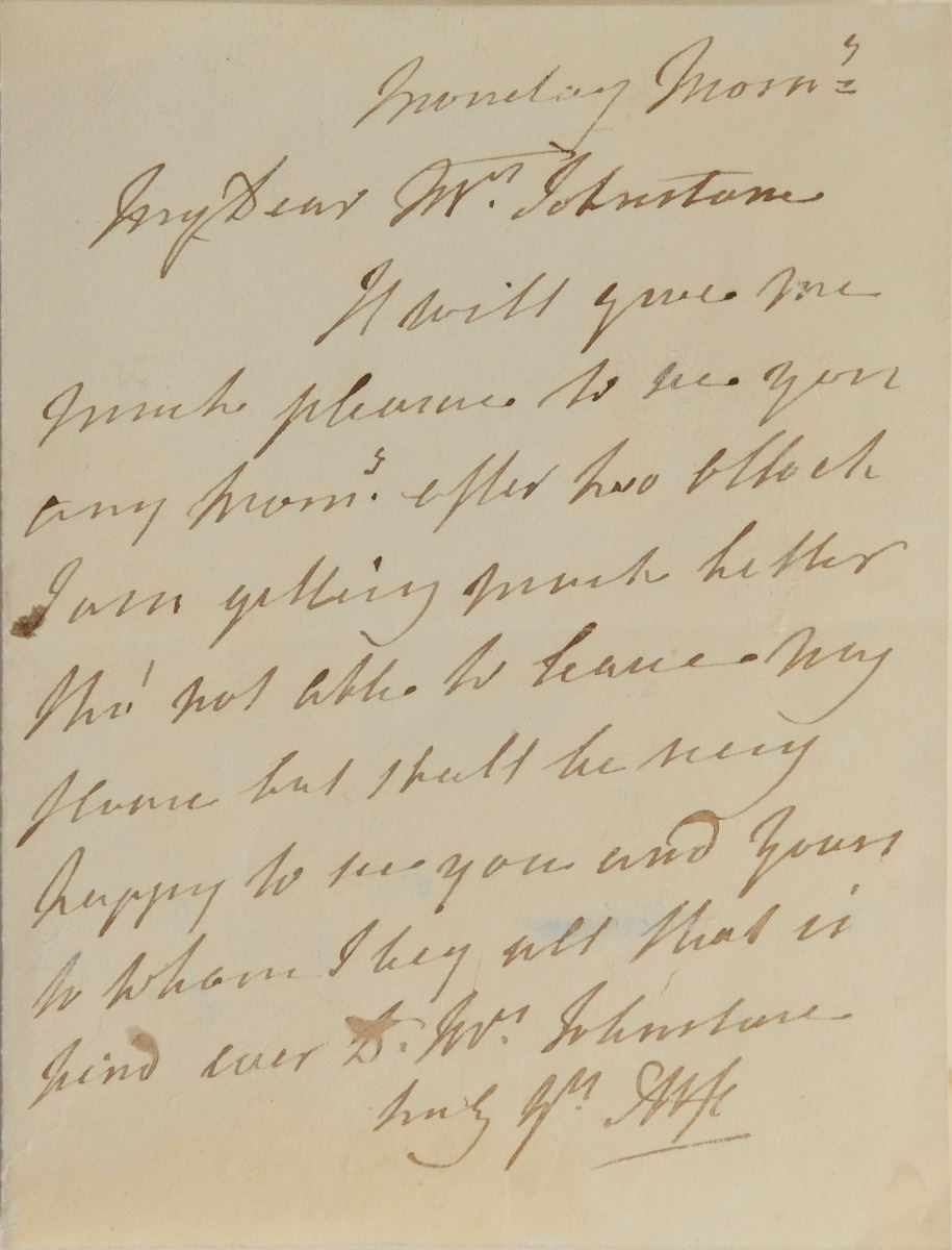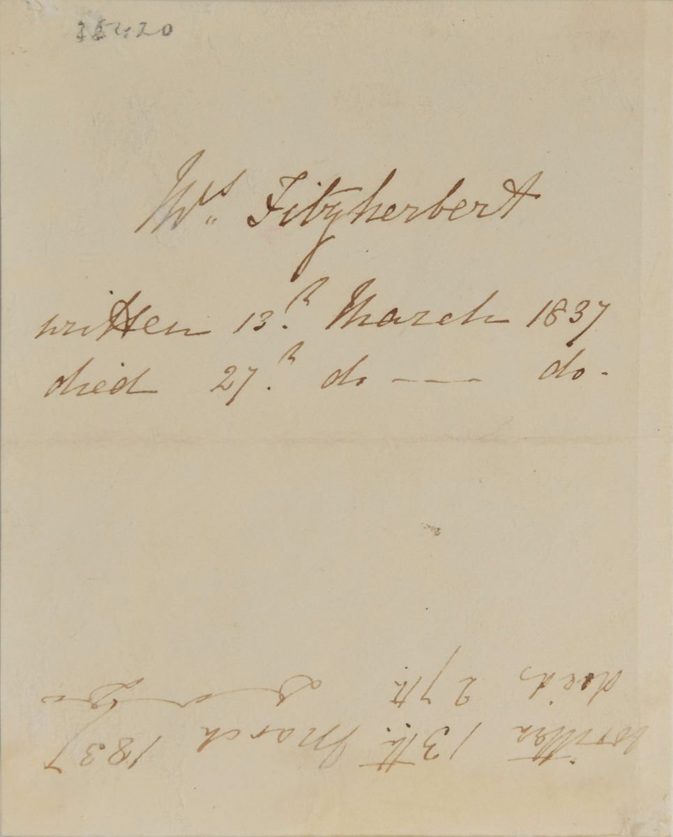 Companion of the future King George IV of the United Kingdom (1756–1837) with whom she secretly contracted a marriage that was invalid under English civil law before his accession to the throne. Very rare ALS signed “MF,” one page, 3.5 x 4.5, March 13, 1837. Letter to Mrs. Johnstone, in part: "It will give me much pleasure to see you any morn'g after two o'clock. I am getting much better tho' not able to leave my home but shall be very happy to see you and yours." Ink notations on the reverse indicate date of letter. In fine condition. Accompanied by the center address panel from the original mailing envelope, addressed in the hand of Fitzherbert, who passed away just two weeks after writing this letter. The first time we have offered Fitzherbert in any format.