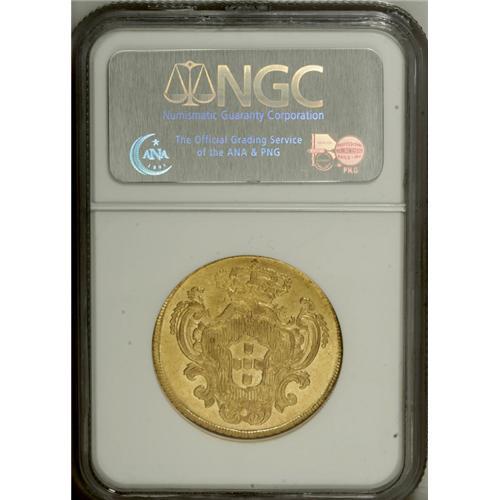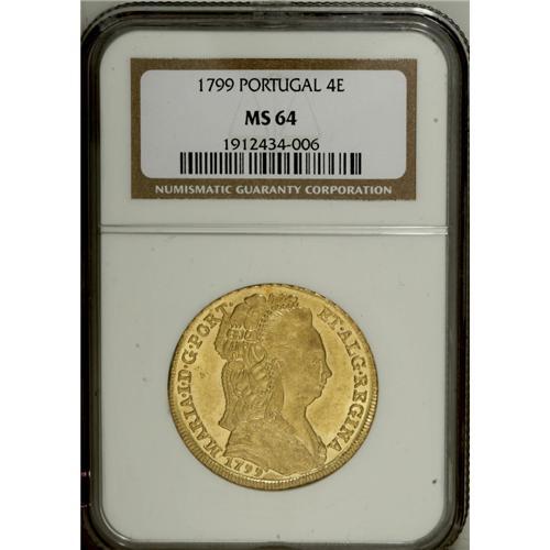 <B>Maria I gold 4 Escudos 1799, </B></I>KM299, MS64 NGC, a superb example with full gleaming mint brilliance and sharply defined design features. Very rare quality for this type.<BR><BR><b>Shipping:</b> Coin/Currency (<a target="_blank" href="http://www.heritageauctions.com/common/shipping.php">view shipping information</a>)