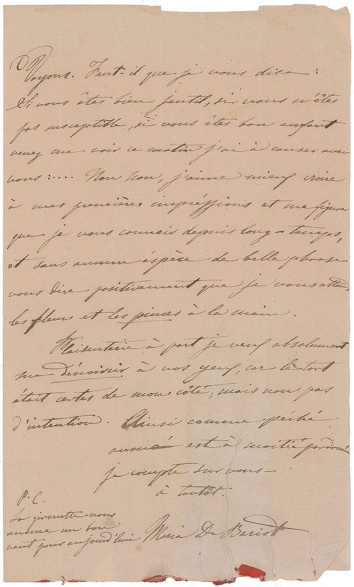 Legendary mezzo-soprano (1808–1836) who was one of the most famous opera singers of the 19th century. She passed away at age 28 from injuries sustained after falling off her horse. ALS in French, signed “Maria de Beriot,” one page, 5.25 x 8.75, no date. Untranslated letter to Baron de Thierry. In very good condition, with a repaired tear passing from the bottom edge through a single letter of the signature and into a few lines of writing, scattered creasing and wrinkling, and chipping to edges.