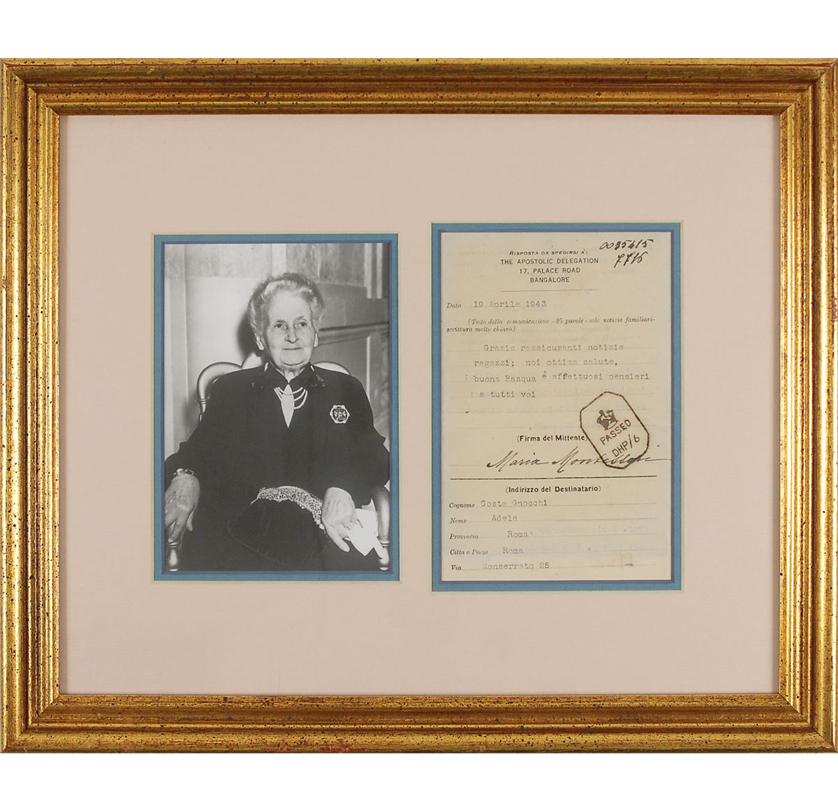 Italian physician and education theorist (1870–1952) who devised the innovative approach to early childhood learning that bears her name. Uncommon TNS in Italian, one page, 4.25 x 6, Apostolic Delegation letterhead, April 19, 1943. A message transmitted to her cousin via Vatican Radio. In full (translated): “Thanks reassuring news kids; we best health, happy Easter and affectionate thoughts to all of you.” Her cousin’s initial transmission is typed on the reverse. Double-matted and framed with an image of Montessori to an overall size of 16 x 13.25, with a window on the reverse for viewing the reverse. In fine condition, with scattered creases, slight show-through from typing on the reverse, and an ink stamp affecting a portion of her last name.