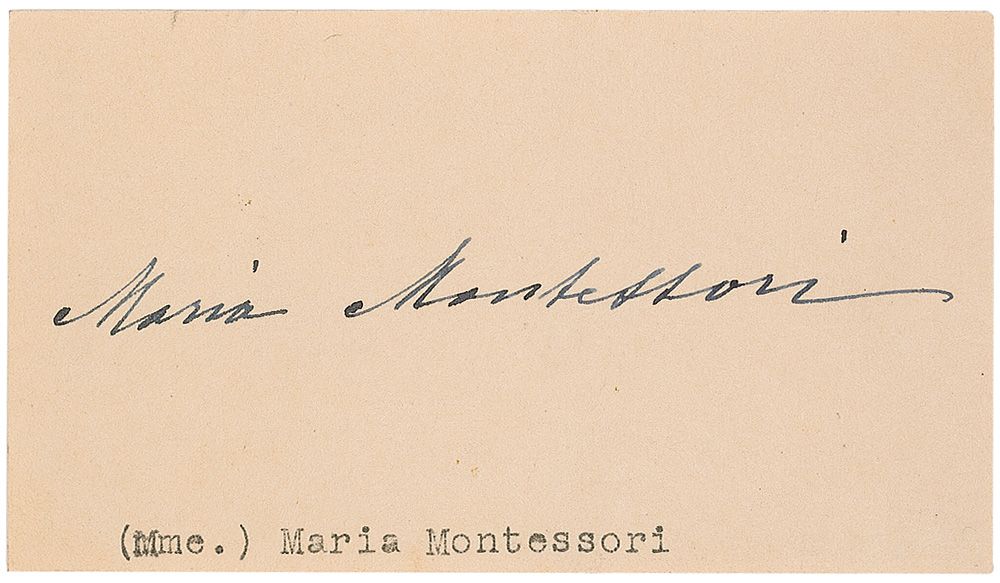 Italian physician and education theorist who devised the innovative approach to early childhood learning that bears her name. Fountain pen signature on an off-white 4 x 2.25 card. In fine condition, with a typed notation to the lower edge.