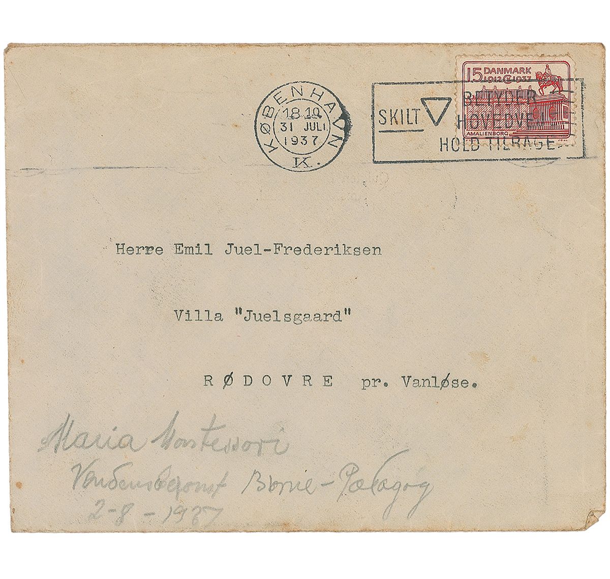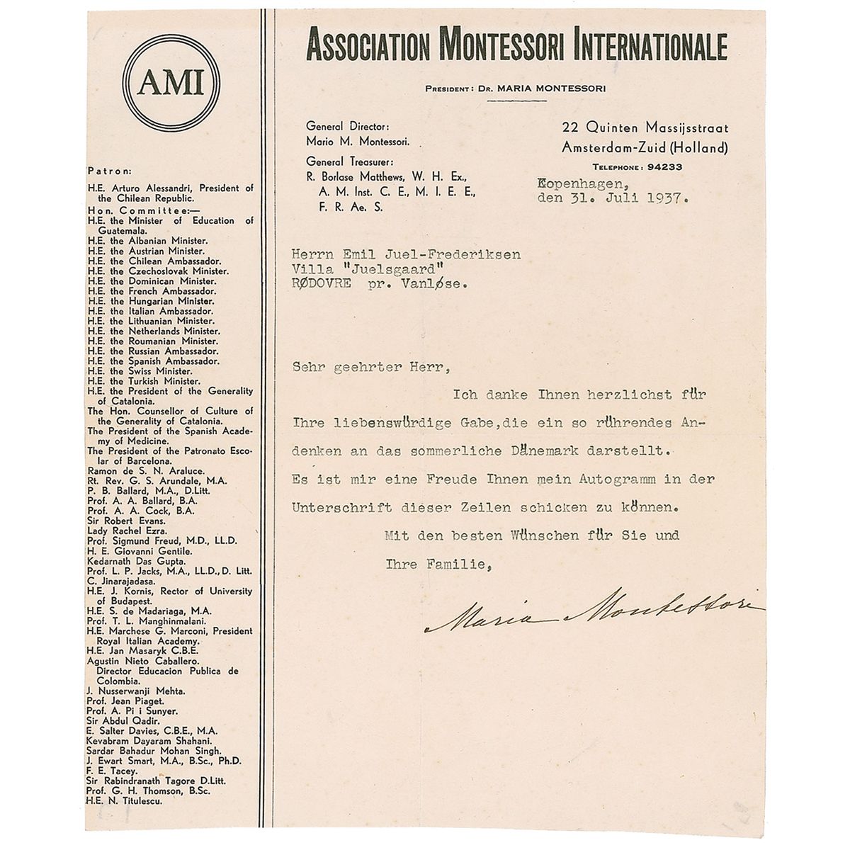 Italian physician and education theorist (1870–1952) who devised the innovative approach to early childhood learning that bears her name. TLS in German, one page, 8 x 9.75, Association Montessori Internationale letterhead, July 31, 1937. Letter to Emil Juel-Frederiksen in Rødovre. In part (translated): “I thank you sincerely for your kind gift, which is such a touching souvenir of Denmark in summer. It is my pleasure to send you my autograph in the signature to these lines.” Lightly trimmed edges, bisecting folds, and a few creases, otherwise fine condition. Accompanied by the original mailing envelope.
