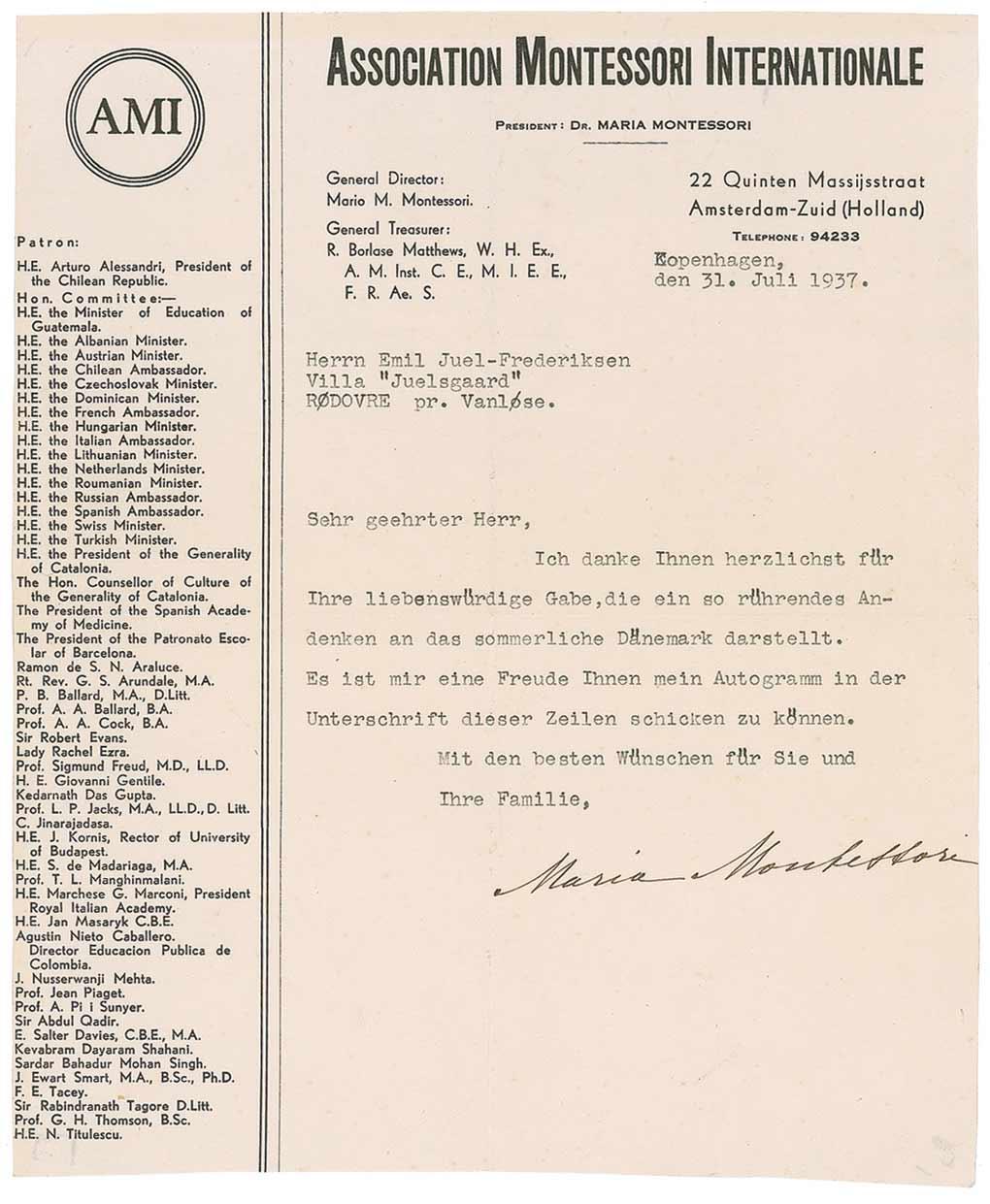 Pioneering Italian doctor and teacher (1870–1952) whose educational philosophy, focusing on the individuality and individual needs of each child, proved to be one of the most influential, if controversial, developments in the history of childhood education. TLS in German, one page, 8 x 9.75, Association Montessori Internationale letterhead, July 31, 1937. Letter to Emil Juel-Frederiksen in Rødovre. In part (translated): “I thank you sincerely for your kind gift, which is such a touching souvenir of Denmark in summer. It is my pleasure to send you my autograph in the signature to these lines.” Accompanied by the original mailing envelope. Lightly trimmed edges, bisecting folds, and a few creases, otherwise fine condition.