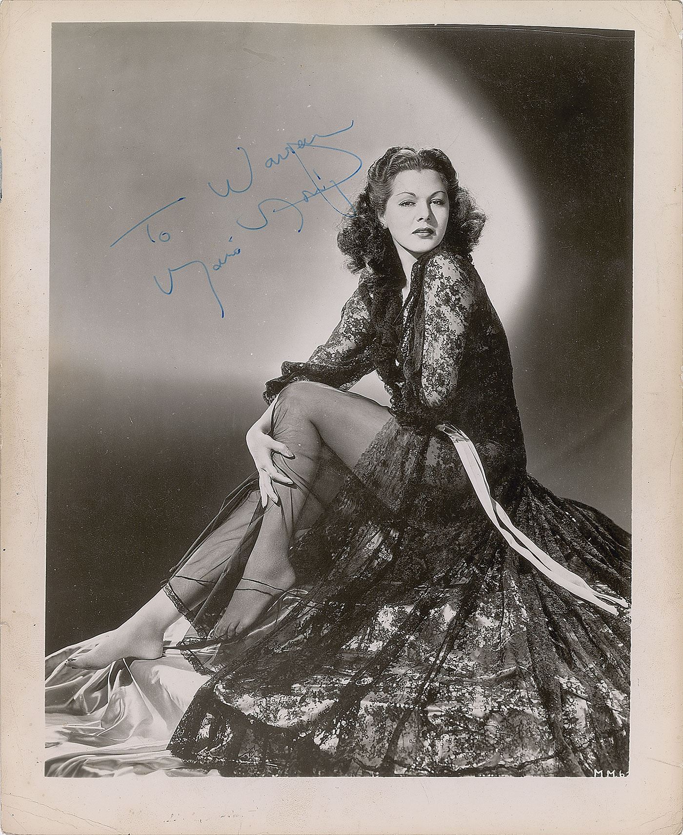 Dominican film actress (1912–1951) whose adventure epics in the 1940s earned her fame and the nickname 'The Queen of Technicolor.' Vintage glossy 8.25 x 10 studio portrait of Montez wearing a long, lacy dress in a beautiful full-length pose, signed and inscribed in fountain pen, "To Warren, Maria Montez.” In fine condition, with scattered light creasing.
